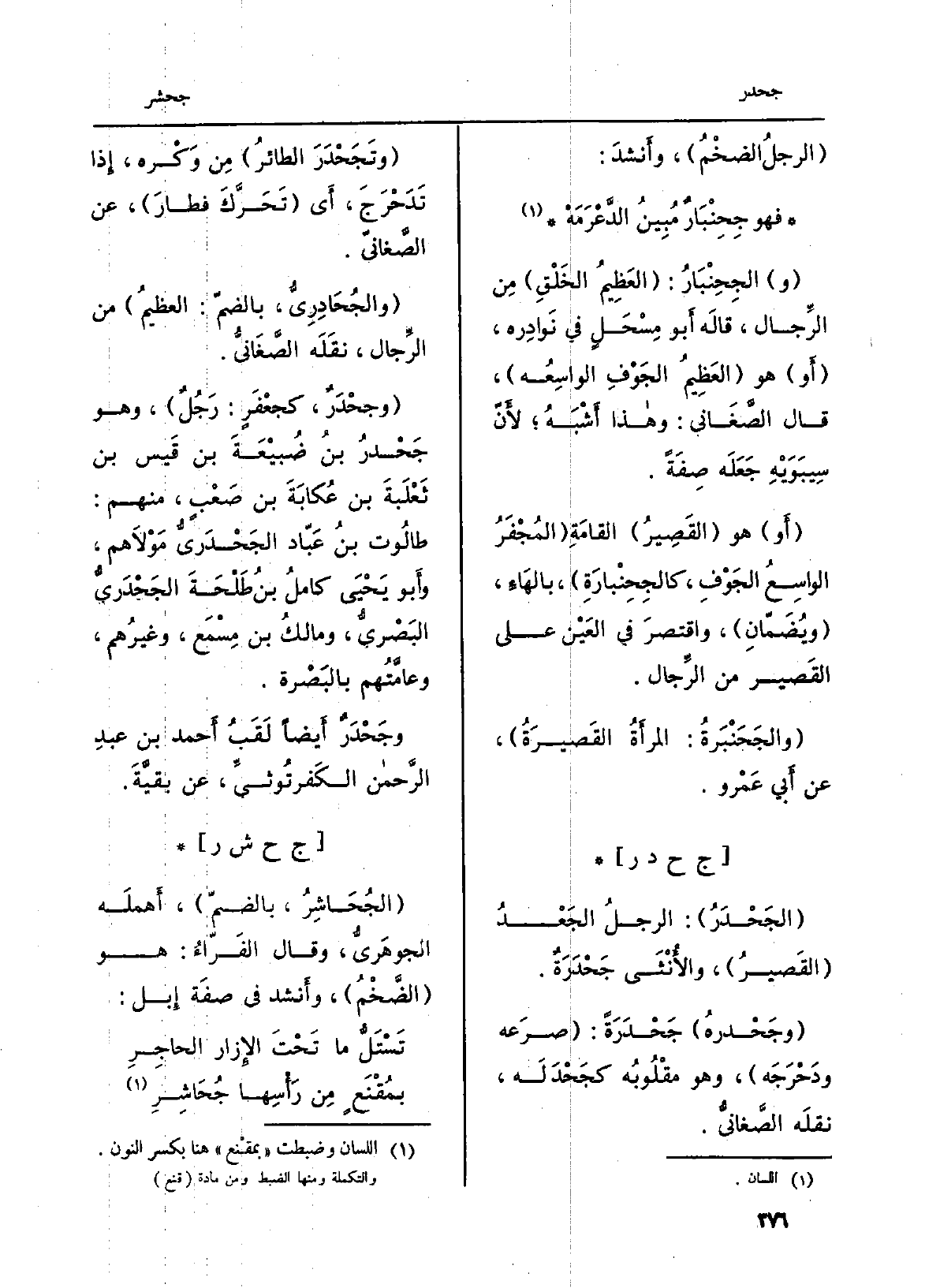 (والجُحَادِرِيُّ، بالضمّ: العظيمُ) من الرِّجال، نقَلَه الصَّغَانيُّ.