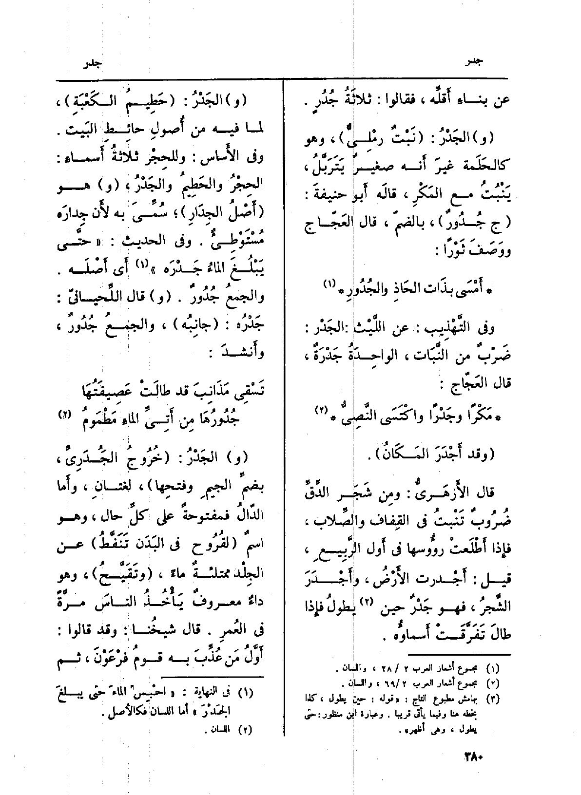 كتاب م كتاب (و) الجَدْرُ: (حَطِيمُ الكَعْبَةِ) ، لما فِيهِ من أُصلِ حائِطِ البَيت. وَفِي الأَساس: وللحِجْر ثلاثةُ أَسماءِ: الحِجْرُ والحَطِيمُ والجدْرُ، (و) هُوَ (أَصْلُ الجِدَارِ) ؛ سُمِّيَ بِهِ لأَن جِدارَه مُسْتَوْطِيءٌ. وَفِي الحَدِيث: (حتَّى يَبْلُغَ الماءُ جَدْرَه) أَي أَصْلَه. والجمعُ جُدُورٌ. (و) قَالَ اللِّحيانيّ: جَدْرُه: (جانِبُه) ، والجمعُ جُدُورٌ،، وأَنشدَ: