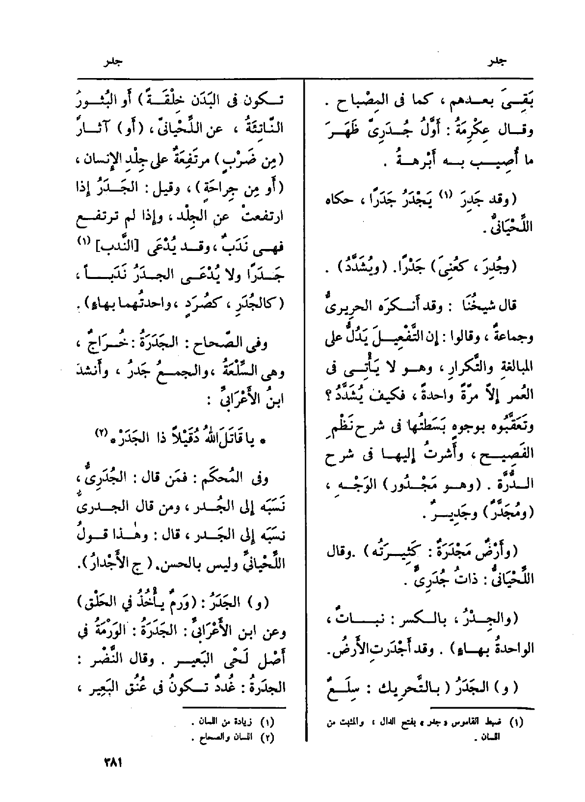 (و) الجَدَرُ: (وَرمٌ يأْخُذُ فِي الحَلْق) وَعَن ابْن الأَعْرَابيِّ: الجَدَرَةُ: الوَرْمَةُ فِي أَصْل لَحْى البَعير. وَقَالَ النَّضْر: الجدَرةُ: غُددٌ تكونُ فِي عُنُق البَعِير،