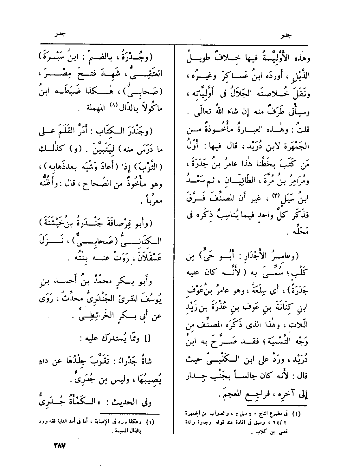وهاذه الأَوَّلِيَّةُ فِيهَا خِلافٌ طويلُ الذَّيْلِ، أَوردَه ابنُ عَساكِرَ وغيرُه، ونَقَلَ خُلاصتَه الجَلَالُ فِي أَوَّلِيَّاتِه، وسيأْتي طَرَفٌ مِنْهُ إِن شاءَ اللهُ تعالَى. قلتُ: وهاذه العبرةُ مأْخُوذةٌ من الجَمْهَرة لِابْنِ دُرَيْد، قَالَ فِيهَا: أَوْلُ مَن كَتَبَ بخَطِّنا هاذا عامرُ بنُ جَدَرَةَ، ومُرَامِرُ بنُ مُرَّةَ، الطّائِيّانِ، ثمَّ سَعْدُ بنُ سَيَلٍ، غير أَن المصنِّفَ فَرَّقَ فذَكَر كلَّ واحدٍ فِيمَا يُناسِبُ ذِكْره فِي مَحَلِّه.