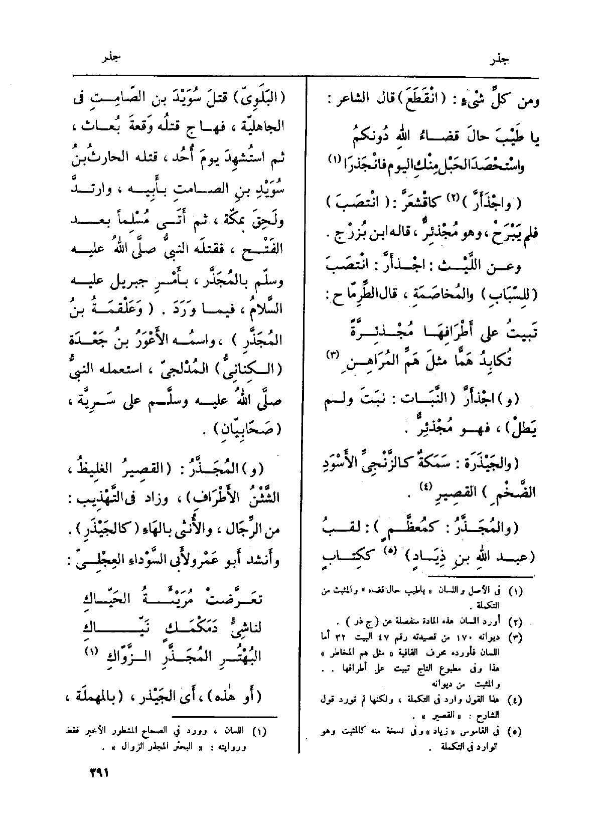 (والمُجَذَّرُ: كمُعظَّمٍ) : لقبُ (عبد اللهِ بنِ ذِيَادٍ) ككِتابٍ (البَلَوِيّ) قتلَ سُوَيْدَ بن الصّامِتِ فِي الجاهليّة، فهاج قتلُه وَقعةَ بُعاث، ثمَّ استشهِدَ يومَ أُحُد، قَتله الحارثُ بنُ سُوَيْدِ بنِ الصامتِ بأَبِيه، وارتدَّ ولَحِق بمكّة، ثمَّ أَتَى مُسْلِماً بعد الفَتْح، فقتلَه النبيُّ صلَّى اللهُ عليْه وسلّم بالمُجَذَّر، بأَمْرِ جِبْرِيل عَلَيْهِ السَّلامُ، فِيمَا وَرَدَ. (وعَلْقمَةُ بنُ المُجَذَّرِ) ، واسمُه الأَعْوَرُ بنُ جَعْدَة (الكِنانِيُّ) المُدْلجيا، اسْتَعْملهُ النبيُّ صلَّى اللهُ عليْه وسلَّم على سَرِيَّة، (صَحَابِيّانِ) .