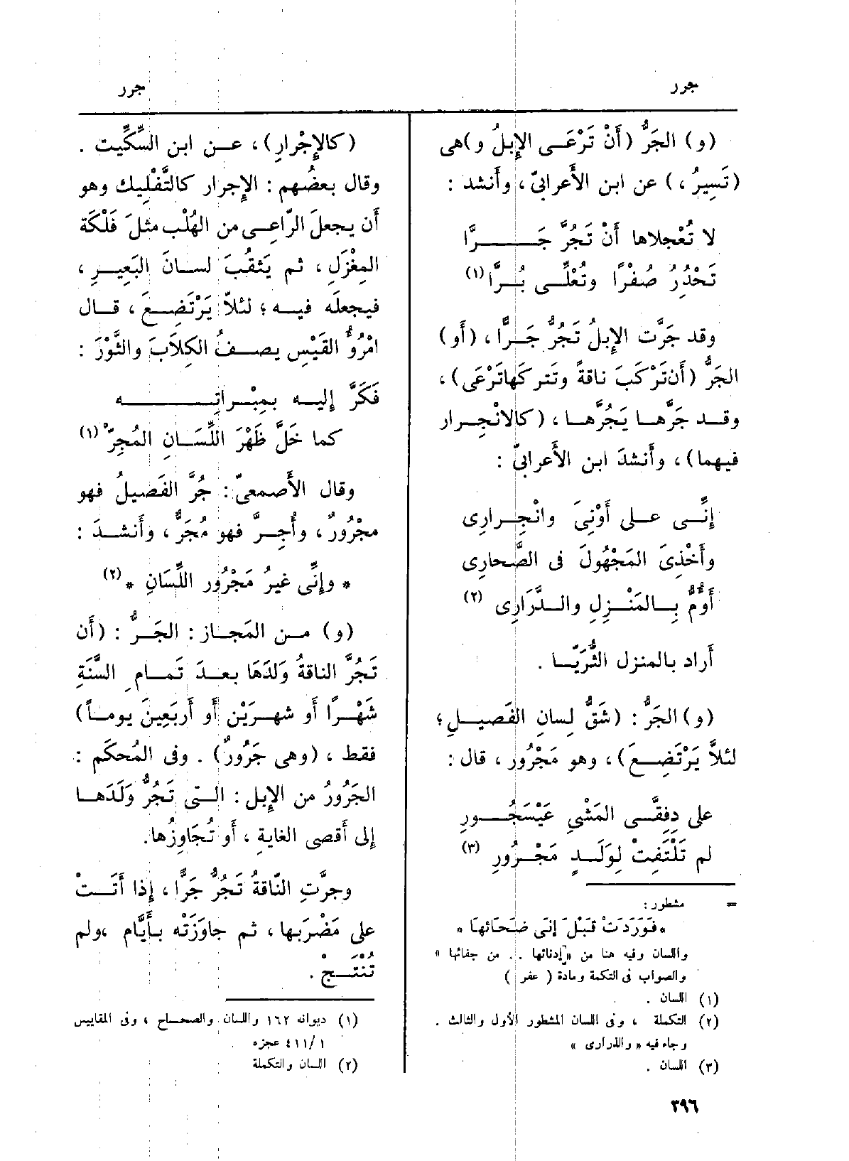 } وجرَّتِ النّاقةُ {تَجُرُّ} جَرًّا، إِذا أَتَتْ على مَضْرَبها، ثمَّ جاوَزَتْه بأَيَّام، وَلم تُنْتَجْ.