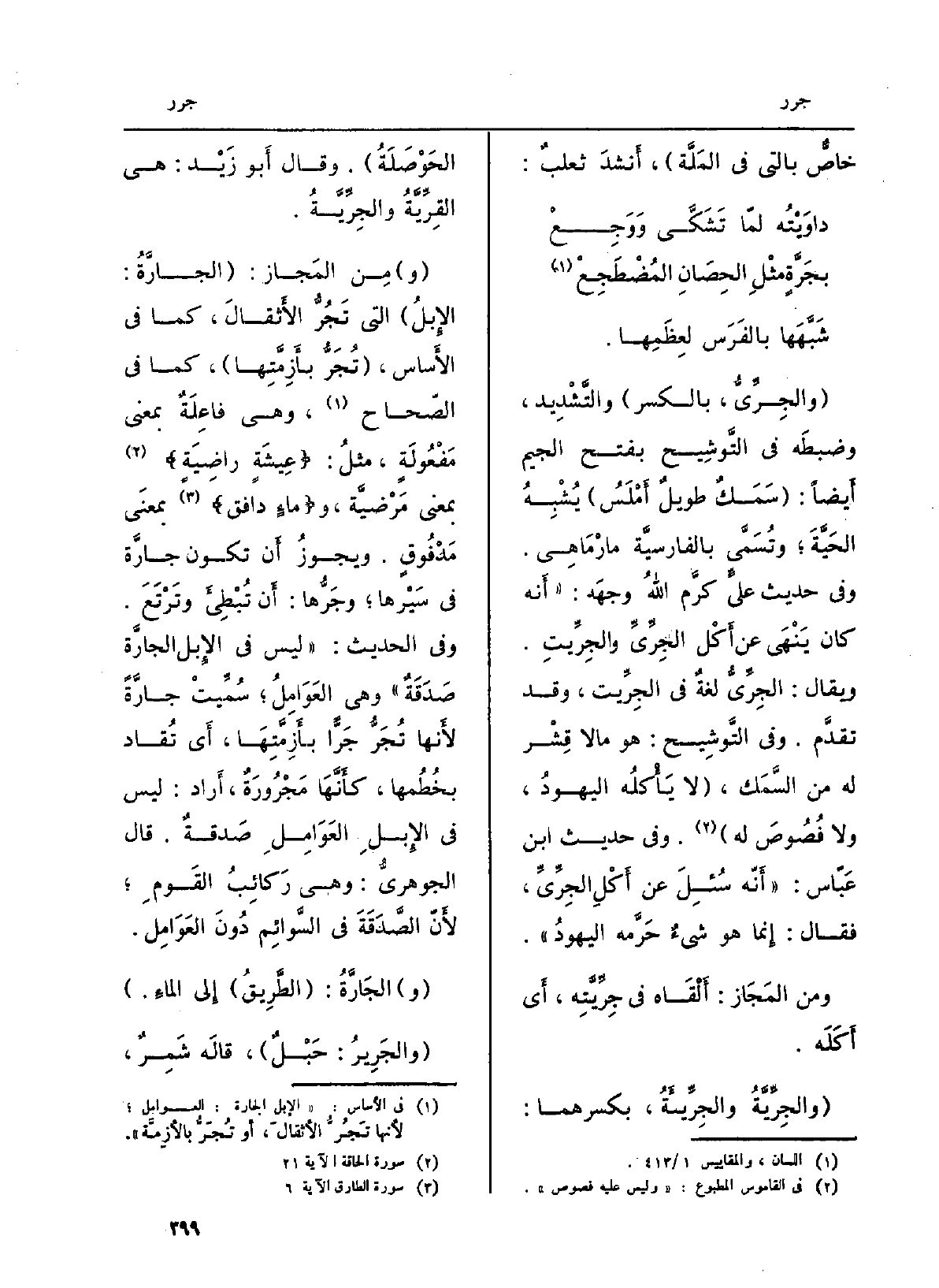 (و) مِن المَجاز: ( {الجارَّةُ: الإِبلُ) الَّتِي} تَجُرُّ الأَثقالَ، كَمَا فِي الأَساس، ( {تُجَرُّ بأَزمَّتِها) ، كَمَا فِي الصّحاح، وَهِي فاعِلَةٌ بِمَعْنى مَفْعُولَةٍ، مثلُ: {عِيشَةٍ رَّاضِيَةٍ} (الحاقة: 21) بِمَعْنى مَرْضيَّة، و {مَّآء دَافِقٍ} (الطارق: 6) بمعنَى مَدْفُوقٍ. ويجوزُ أَن تكون} جارَّة فِي سَيْرها؛ {وجرُّها أَن تُبْطيءَ وتَرْتَعَ. وَفِي الحَدِيث: (لَيْسَ فِي الإِبل الجارَّة صَدَقَةٌ) وَهِي العَوَامِلُ؛ سُمِّيتْ} جارَّةً لأَنها {تُجَرُّ} جَرًّا بأَزِمَّتِهَا، أَي تُقاد بخُطُمها، كأَنَّهَا {مَجْرُورَةٌ، أَراد: لَيْسَ فِي الإِبلِ العَوَامِلِ صَدقةٌ. قَالَ الجوهريُّ: وَهِي رَكائِبُ القَومِ؛ لأَنّ الصَّدَقَةَ فِي السَّوائم دُونَ العَوَامِل.