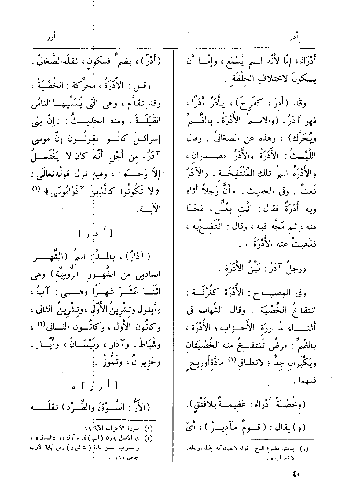 وَفِي المِصباح: {الأُدْرَة كغُرْفَة: انتفاخُ الخُصْيَة. وَقَالَ الشِّهاب فِي أَثناءِ سُرَةِ الأَحزاب؛} الأُدْرَة، بالضّمِّ: مرضٌ تَنتفخُ مِنْهُ الخُصْيَتانِ ويَكْبُرانِ جِدًّا؛ لانطباقِ مادَّةٍ أَو رِيحٍ فيهمَا.