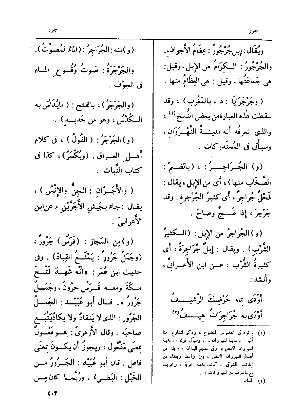 (و) الجُراجرُ من الإِبل: (الكثيرُ الشُّرْبِ) . وَيُقَال: إِبلٌ {جُرَاجِرَةٌ، أَي كثيرةُ الشُّرْب، عَن ابْن الأَعرابيِّ، وأَنشد: