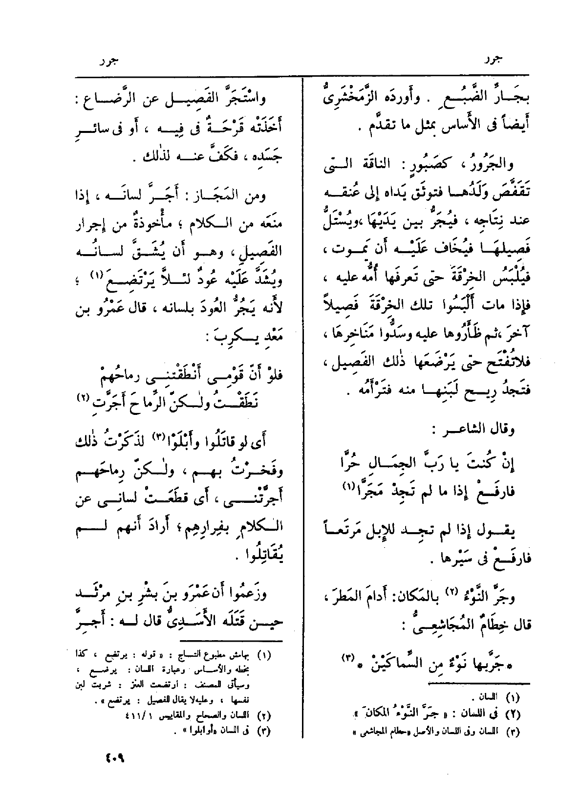 وَمن المَجَاز:} أَجَرَّ لسانَه، إِذا منَعَه من اللَّام؛ مأْخوذةٌ من {إِجرار الفَصِيلِ، وَهُوَ أَن يُشَقَّ لسانُه ويُشَدَّ عَلَيْه عُودٌ لئلَّا يَرْتَضِعَ؛ لأَنه} يَجُرُّ العُودَ بِلِسَانِهِ، قَالَ عَمْرُو بن مَعْدِ يكرِبَ: