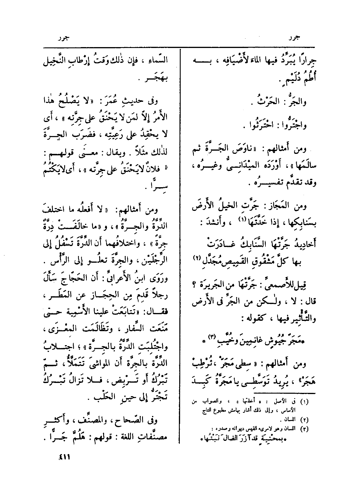 قِيل للأَصمعيِّ:} جَرَّتْهَا من الجَريرَة؟ قَالَ: لَا، ولاكن من الجَرِّ فِي الأَرض والتَّأْثِير فِيهَا، كَقَوْلِه: