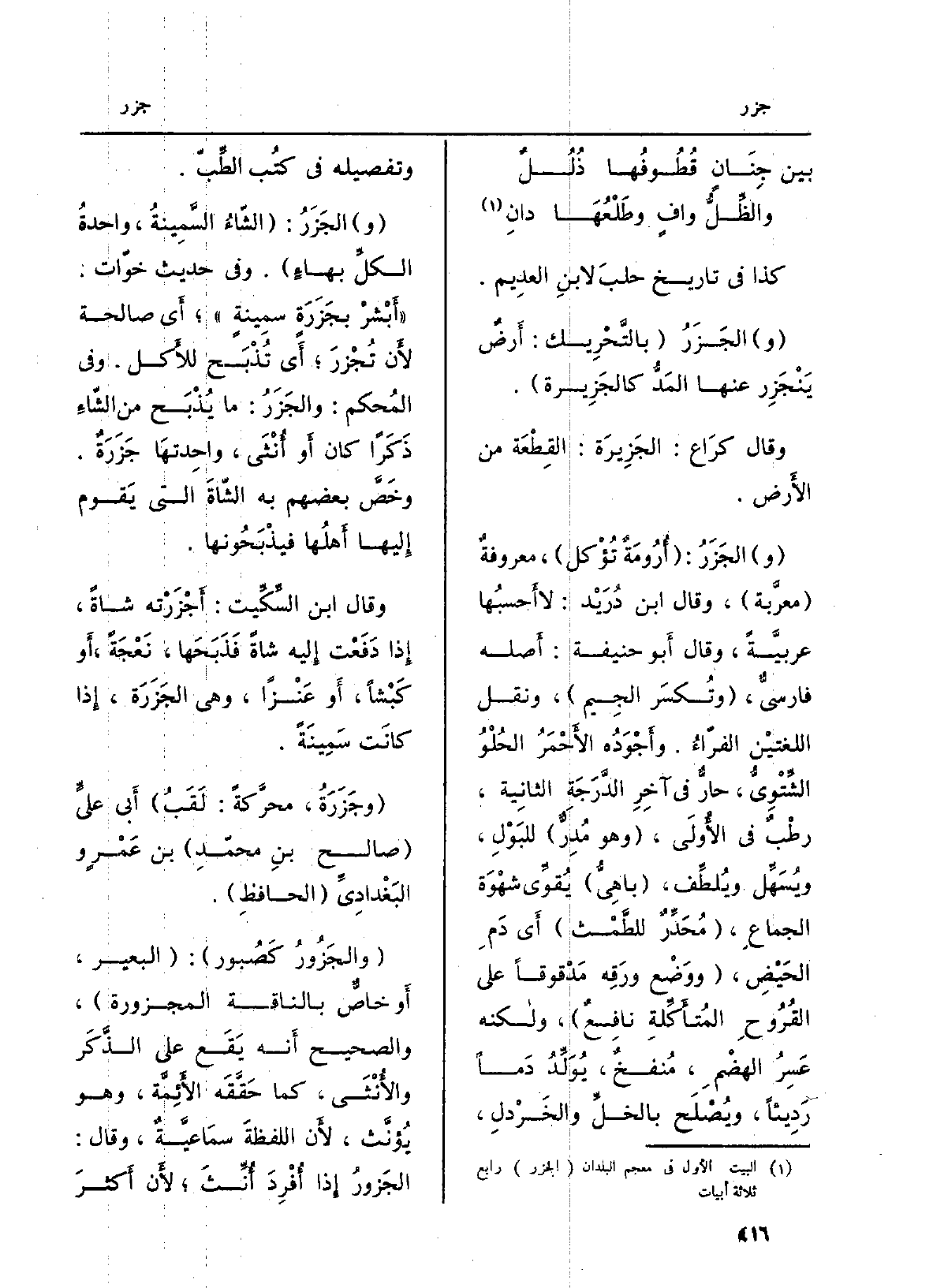 (و) الجَزَرُ: (الشّاءُ السَّمِينةُ، واحدةُ الكلِّ بهاءٍ) . وَفِي حَدِيث خوّات: (أَبْشرْ بجَزَرَةٍ سمِينةٍ) ؛ أَي صَالِحَة لأَن تُجْزرَ؛ أَي تُذْبَح للأَكل. وَفِي المُحكم: والجَزَرُ: مَا يُذْبَح من الشّاءِ ذَكَراً كَانَ أَو أُنْثَى، واحِدتهَا جَزَرَةٌ. وخَصَّ بَعضهم بِهِ الشّاةَ الَّتِي يَقوم إِليها أَهلُها فيذْبَحُونها.