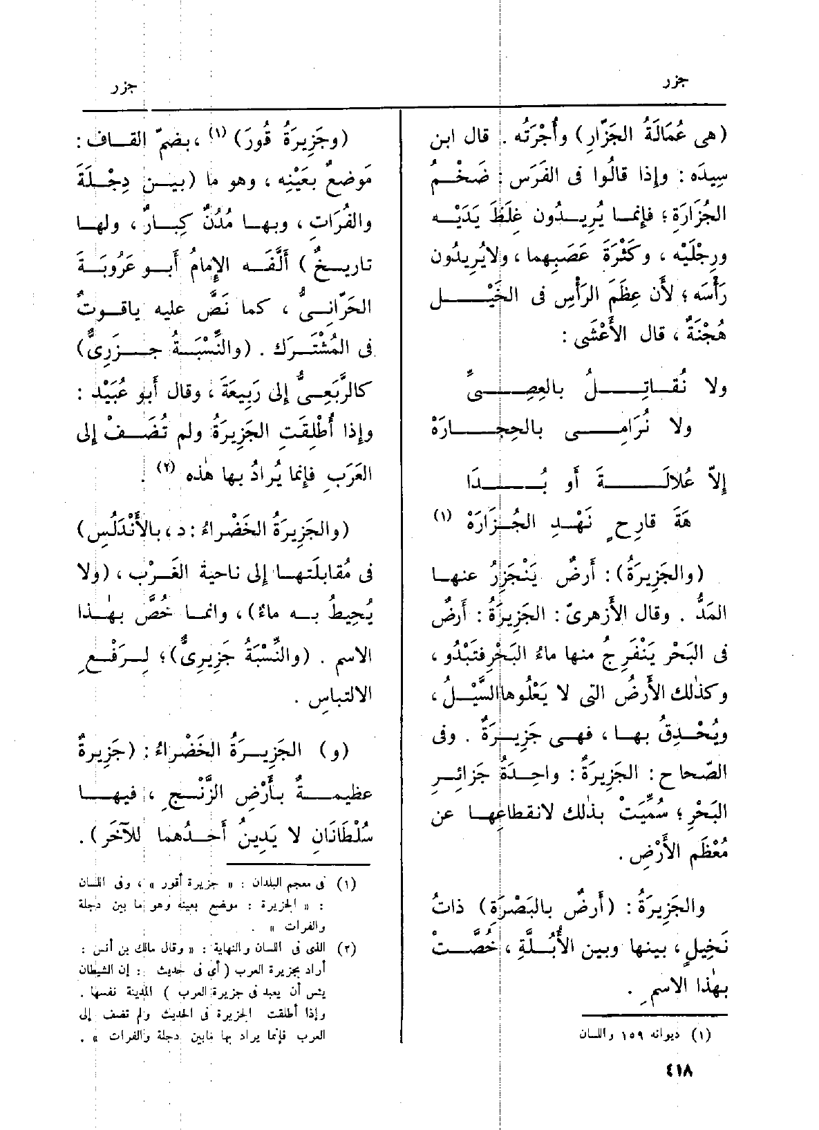 والجَزِيرةُ: (أَرضٌ بالبَصْرَةِ) ذاتُ نَخِيلٍ، بَينهَا وَبَين الأُبُلَّةِ، خُصَّتْ باهذا الإِسمِ.