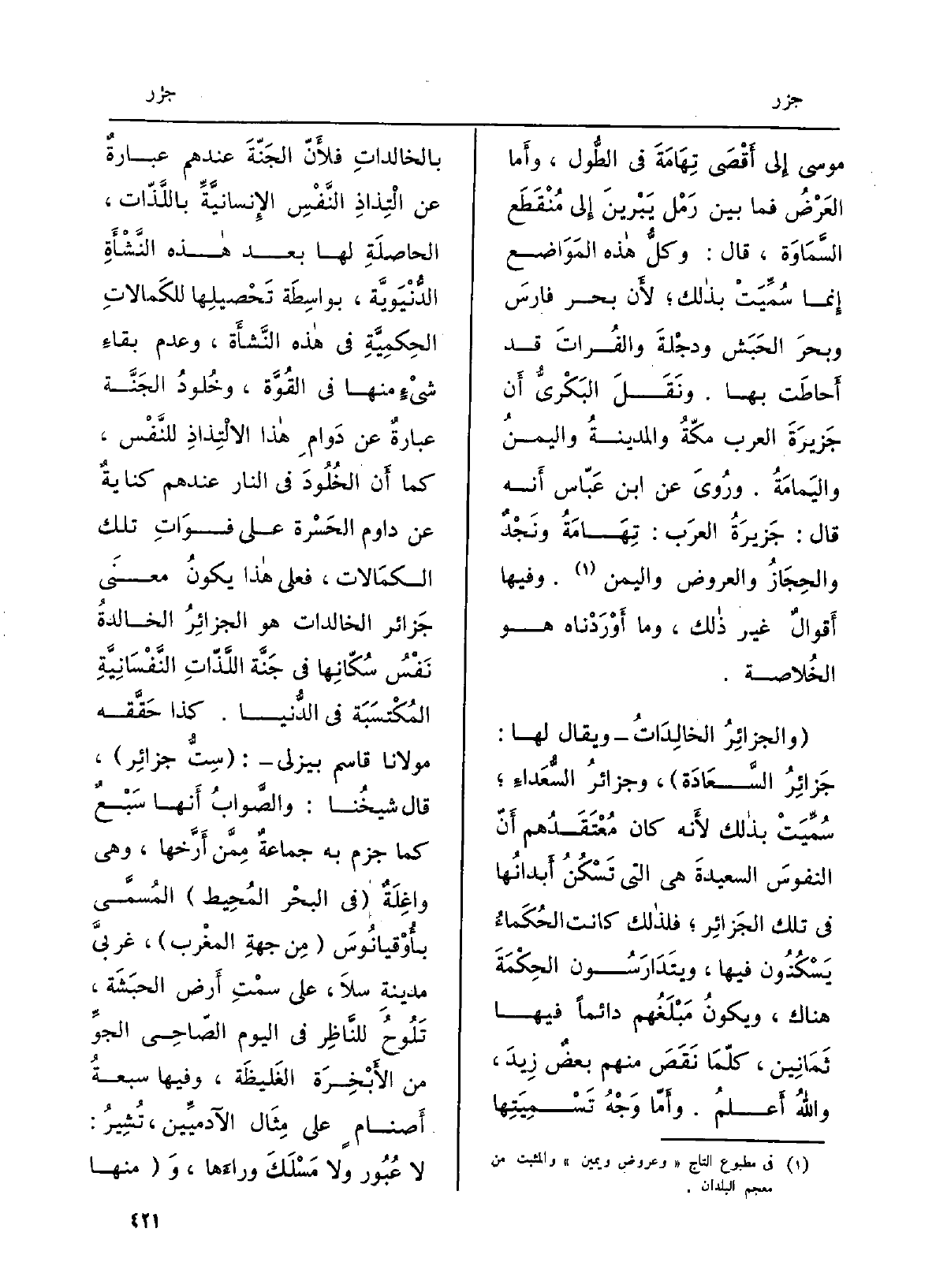 (والجزئِرُ الخالِدَاتُ وَيُقَال لَهَا: جَزائِرُ السَّعَادَة) ، وجزائرُ السُّعَداءِ؛ سُمِّيَتْ بذالك لأَنه كَانَ مُعْتَقَدُهم أَنّ النفوسَ السعيدةَ هِيَ الَّتِي تَسْكُنُ أَي أَبادانُها فِي تِلْكَ الجَزائِر؛ فلذالك كَانَت الحُكَماءُ يَسْكُنُون فِيهَا، ويَتَدَارَسُون الحِكْمَةَ هُنَاكَ، ويكونُ مَبْلَغُهم دَائِما فِيهَا ثَمَانِين، كلّمَا نَقَصَ مِنْهُم بعضٌ زِيدَ، واللهُ أَعلمُ. وأَمّا وَجْهُ تَسْمِيَتِها بالخالداتِ فلأَنّ الجَنْةَ عِنْدهم عبارةٌ عَن الْتِذاذِ النَّفْسِ الإِنسانيَّةَ باللَّذّات، الحاصلَةِ لَهَا بعد هاذه النَّشْأَةِ الدُّنْيَويَّة، بواسِطَة تَحْصيلِها للكَمالاتِ الحِكمِيَّةِ فِي هاذه النَّشأَة، وَعدم بقاءِ شيْءٍ مِنْهَا فِي القُوَّة، وخُلودُ الجَنَّة عبارةٌ عَن دَوامِ هاذا الالْتِذاذِ للنَّفْس، كَمَا أَن الخُلُودَ فِي النَّار عِنْدهم كنايةٌ عَن داوم الحَسْرة على فوَاتِ تِلْكَ الكمَالات، فعلى هاذا يكونُ معنَى جَزائر الخالدات هُوَ الجَزئِرُ الخالدةُ نَفْسُ سُكّانِها فِي جَنَّة اللَّذّاتِ النَّفْسَانِيَّةِ المُكْتسَبَة فِي الدُّنيا. كَذَا حَقَّقه مَوْلَانَا قَاسم بيزلي: (سِتُّ جَزائِرَ) ، قَالَ شيخُنا: والصَّوابُ أَنها سَبْعٌ كَمَا جَزم بِهِ جماعةٌ مِمَّن أَرَّخها، وَهِي واغِلَةٌ (فِي البَحْر المُحِيط) المُسَمَّى بأُوْقيانُوسَ (من جهَةِ المَغْرب) ، غربيَّ مَدِينَة سَلَا، على سَمْتِ أَرض الحَبَشَة، تَلُوحُ للنَّاظِر فِي الْيَوْم الصّاحِي الجوِّ من الأَبْخِرَة الغَليظَة، وفيهَا سبعةُ أَصنامٍ على مِثَال الآدميِّين، تُشِيرُ: لَا عُبُورَ وَلَا مَسْلِكَ وراءَهَا، وَ (مِنْهَا