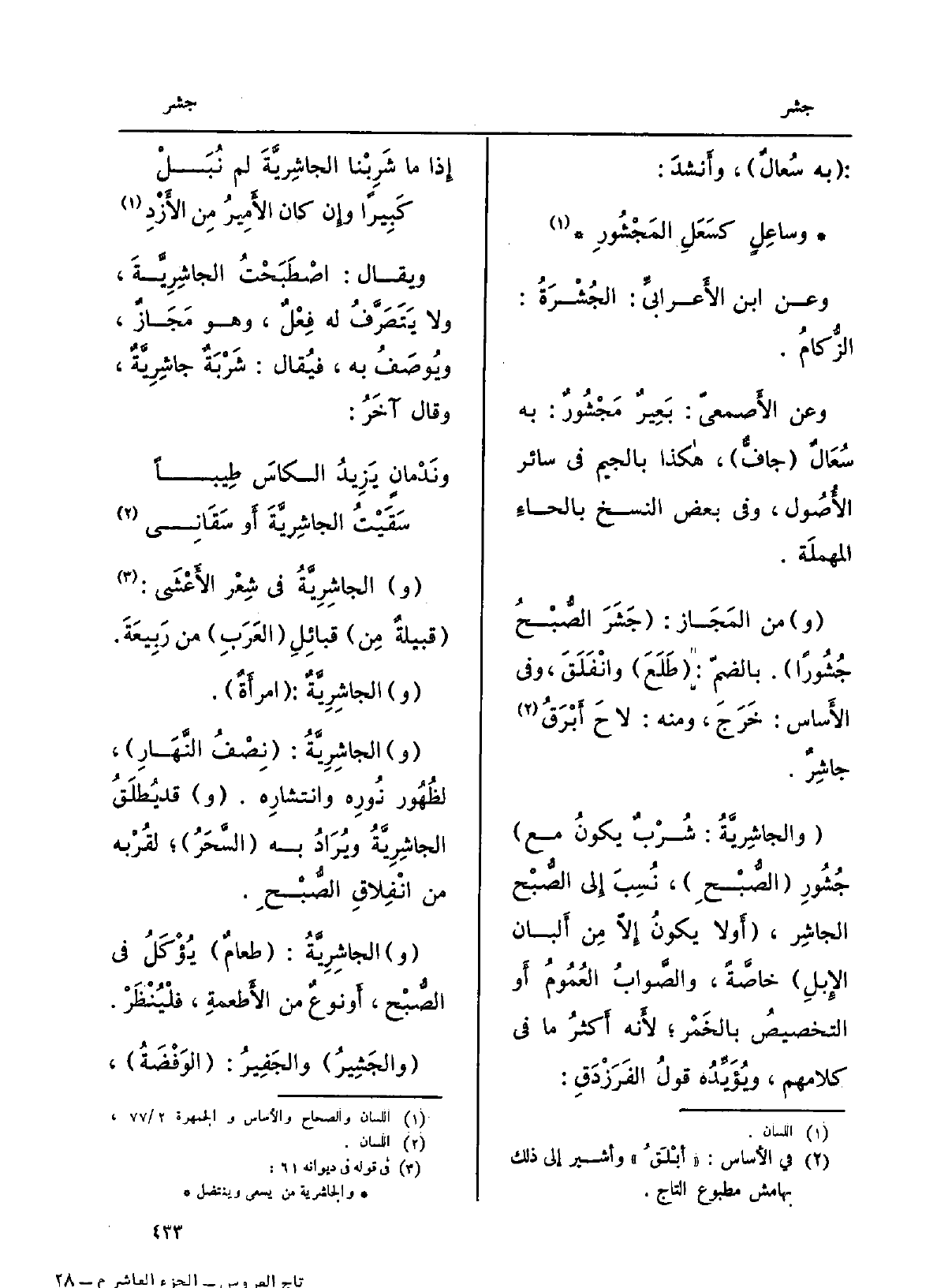 وَيُقَال: اصْطَبَحْتُ الجاشِرِيَّةَ، وَلَا يَتَصَرَّفُ لَهُ فِعْلٌ، وَهُوَ مَجَازٌ، ويُوصَفُ بِهِ، فيُقال: شَرْبَةٌ جاشِرِيَّةٌ، وَقَالَ آخَرُ: