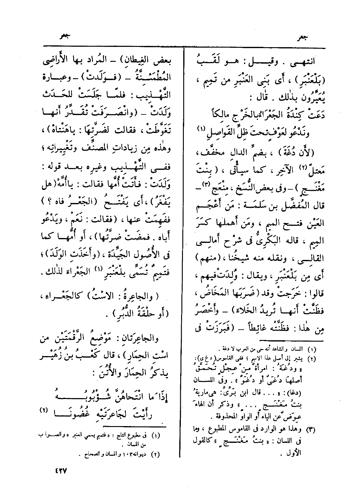 (لأَن دُغَةَ) ، بضمِّ الدالِ مخفَّف، مَعتلّ الآخِر، كَمَا سيأْتي، (بِنْتَ مَغْنَجٍ) وَفِي بعض النُّسَخ، مِنْعَج قَالَ المُفضَّل بن سَلَمة: مَن أَعْجَم العَيْن فتح الْمِيم، ومَن أَهملها كسَرَ المِيم، قَالَه البَكْرِيُّ فِي شرْح أَمَالِي القالِي، وَنَقله مِنْهُ شيخُنا، (مِنْهُم) أَي مِن بَلْعَنْبَرِ، وَيُقَال: وُلِدَتْ فيهم، قَالُوا: خَرَجتْ وَقد (ضَرَبَها المَخَاضُ، فظَنَّتْ أَنها تُريدُ الخَلاءَ) وأَخْصَرُ مِن هاذا: فظَنَّتْه غائِطاً (فَبَرَزَتْ فِي بعض الغِيطانِ) المُراد بهَا الأَراضِي المُطْمَئِنَّةُ (فوَلَدَتْ) وَعبارَة التَّهْذِيب: فلمّا جَلَسَتْ للحَدَث وَلَدَتْ (وانْصَرَفَتْ تُقَدِّرُ أَنها تَغَوَّطَتْ، فَقَالَت لضَرَّتِهَا: يَا هَنْتاهْ) ، وهاذه مِن زياداتِ المصنِّف وتَغْيِيراتِه؛ فَفِي التَّهْذِيب وغيرِه بعد قَوْله: وَلَدَتْ: فأَتَتْ أُمَّها فَقَالَت: يَا أُمَّهْ (هَل يَفْغَرُ) ، أَي يَفْتَحُ (الجَعْرُ فَاه؟) ففَهِمَتْ عَنْهَا، (فَقَالَت: نَعَمْ، ويَدعُو أَباه. فمضَتْ ضرَّتُها) ، أَو أُمُّها كَمَا فِي الأُصُول الجَيِّدَة، (وأَخَذَتِ الوَلَدَ) ؛ فتَمِيمٌ تُسَمِّي بلُعَنْبَرِ الجَعْراءَ لذالك.