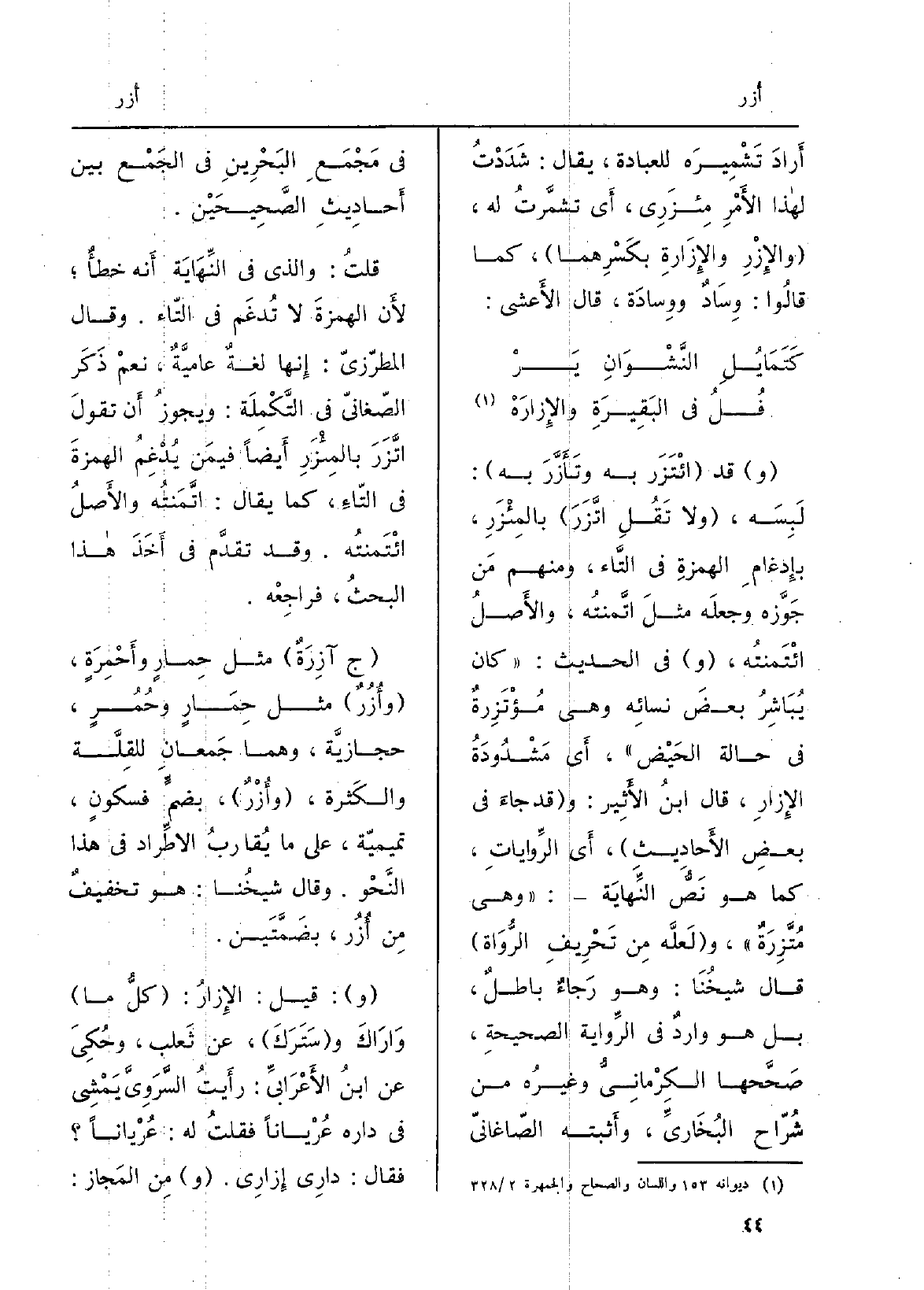 (ج {آزِرَةٌ) مثل حِمارٍ وأَحْمِرَةٍ، (} وأُزُرٌ) مثل حِمَارٍ وحُمُرٍ، حجازيَّة، وهما جَمعانِ للقِلَّة والكَثرة، ( {وأُزْرٌ) ، بضمَ فسكونٍ، تميميّة، على مَا يُقاربُ الاطِّراد فِي هَذَا النَّحْو. وَقَالَ شيخُنا: هُوَ تخفيفٌ مهن} أُزُر، بضَمَّتَين.