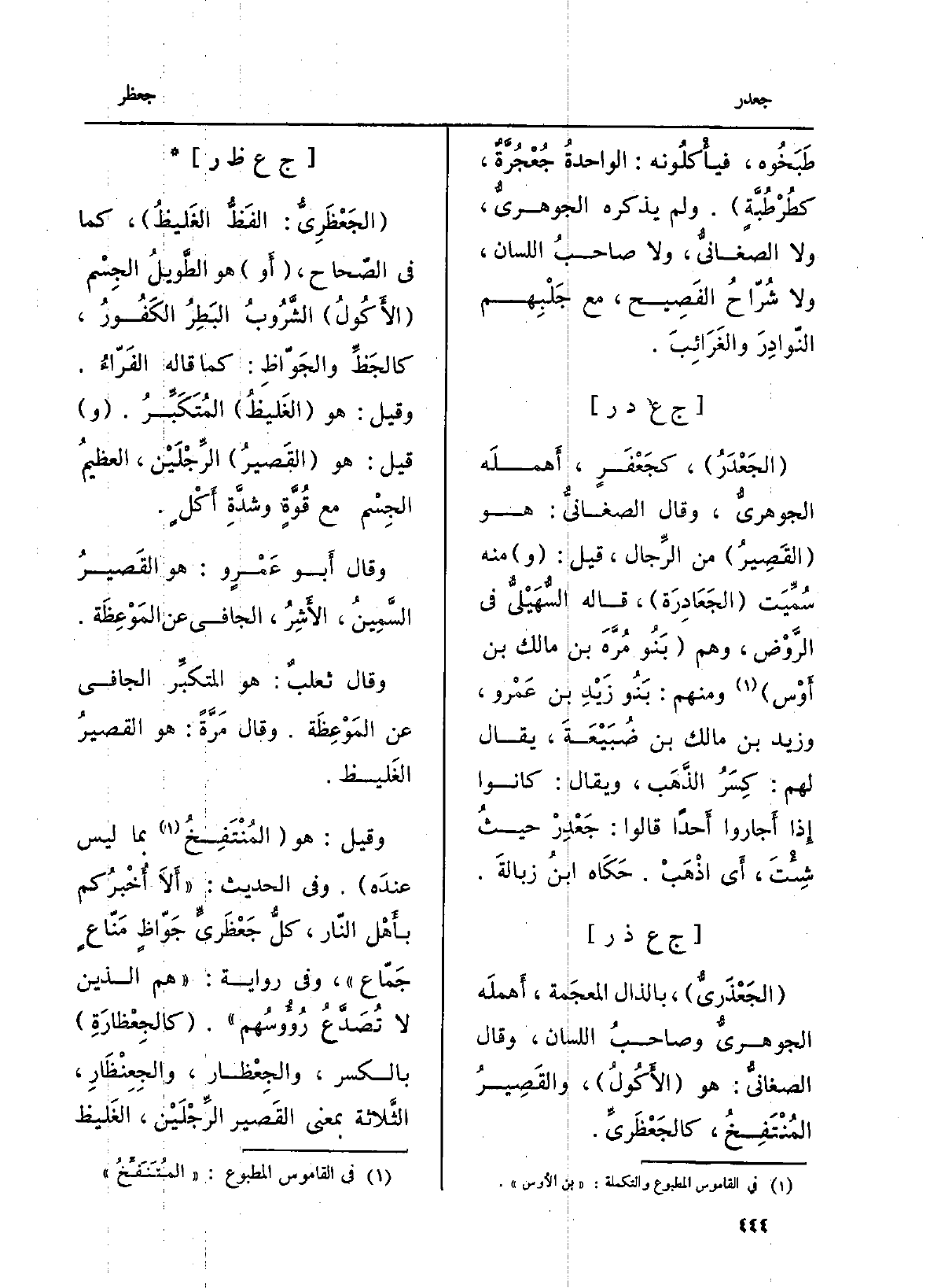 طَبَخُوه، فيأْكلُونه: الواحدةُ جُعْجُرَّةٌ، كطُرْطُبَّةٍ) . وَلم يذكرهُ الجوهريُّ، وَلَا الصغانيُّ، وَلَا صاحبُ اللِّسَان، وَلَا شُرّاحُ الفَصِيح، مَعَ جَلْبِهم النّوادِرَ والغَرَائِبَ.