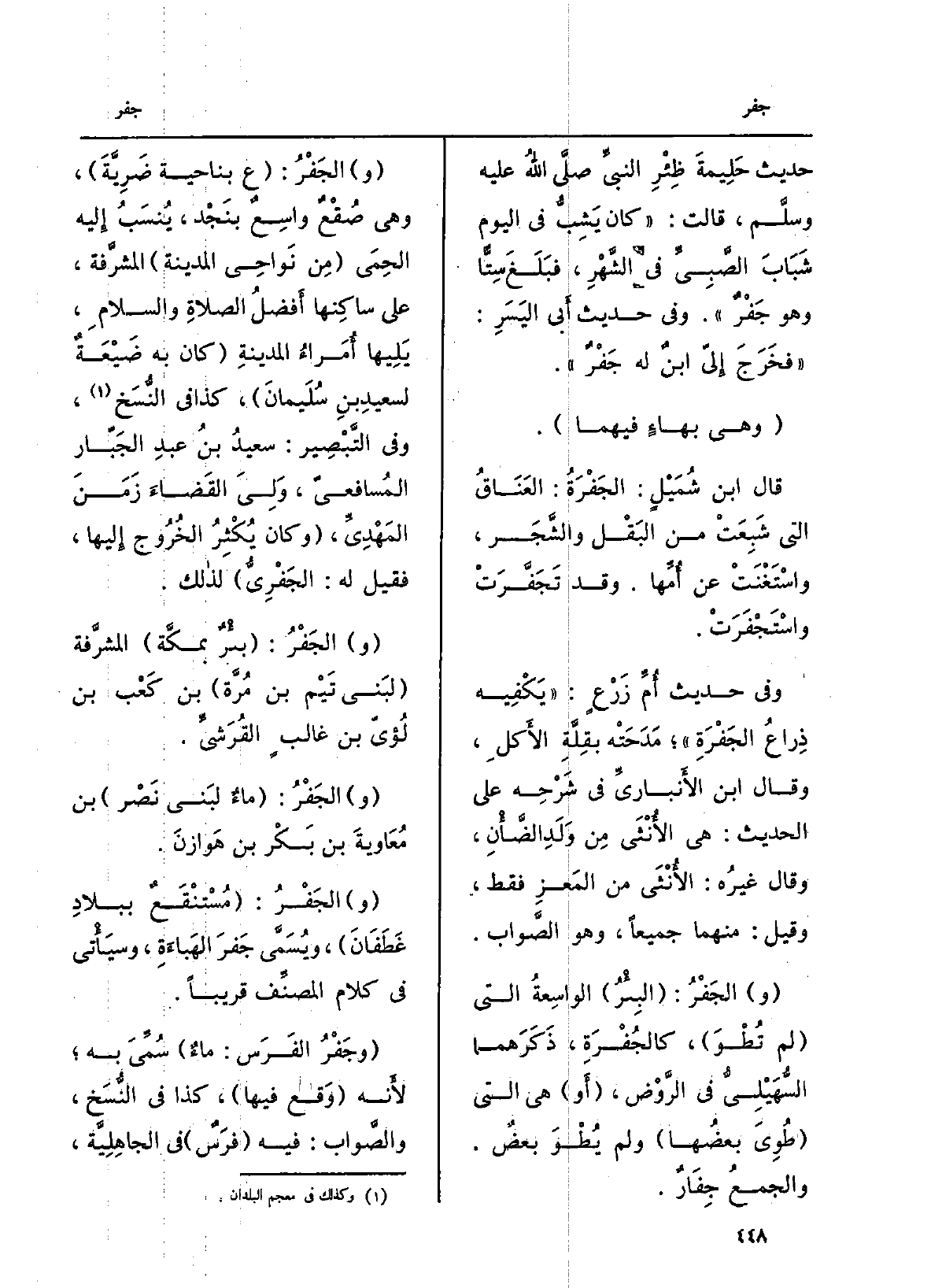 (و) الجَفْرُ: (ع بِنَاحِيَة ضَرِيَّةَ) ، وَهِي صُقْعٌ واسِعٌ بنَجْد، يُنسَبُ إِليه الحِمَى (مِن نَواحِي الْمَدِينَة) المشرَّفة، على ساكِنها أَفضلُ الصلاةِ والسلامِ، يَلِيها أُمَراءُ المدينةِ (كَانَ بِهِ ضَيْعَةٌ لسعيدِ بنِ سُلَيمانَ) ، كَذَا فِي النُّسَخ، وَفِي التَّبْصِير: سعيدُ بنُ عبدِ الجَبّار المُسافعيّ، وَلِيَ القَضاءَ زَمَنَ المَهْدِيِّ، (وَكَانَ يُكْثِرُ الخُرُوج إِليها، فَقيل لَهُ: الجعفْرِيُّ) لذالك.