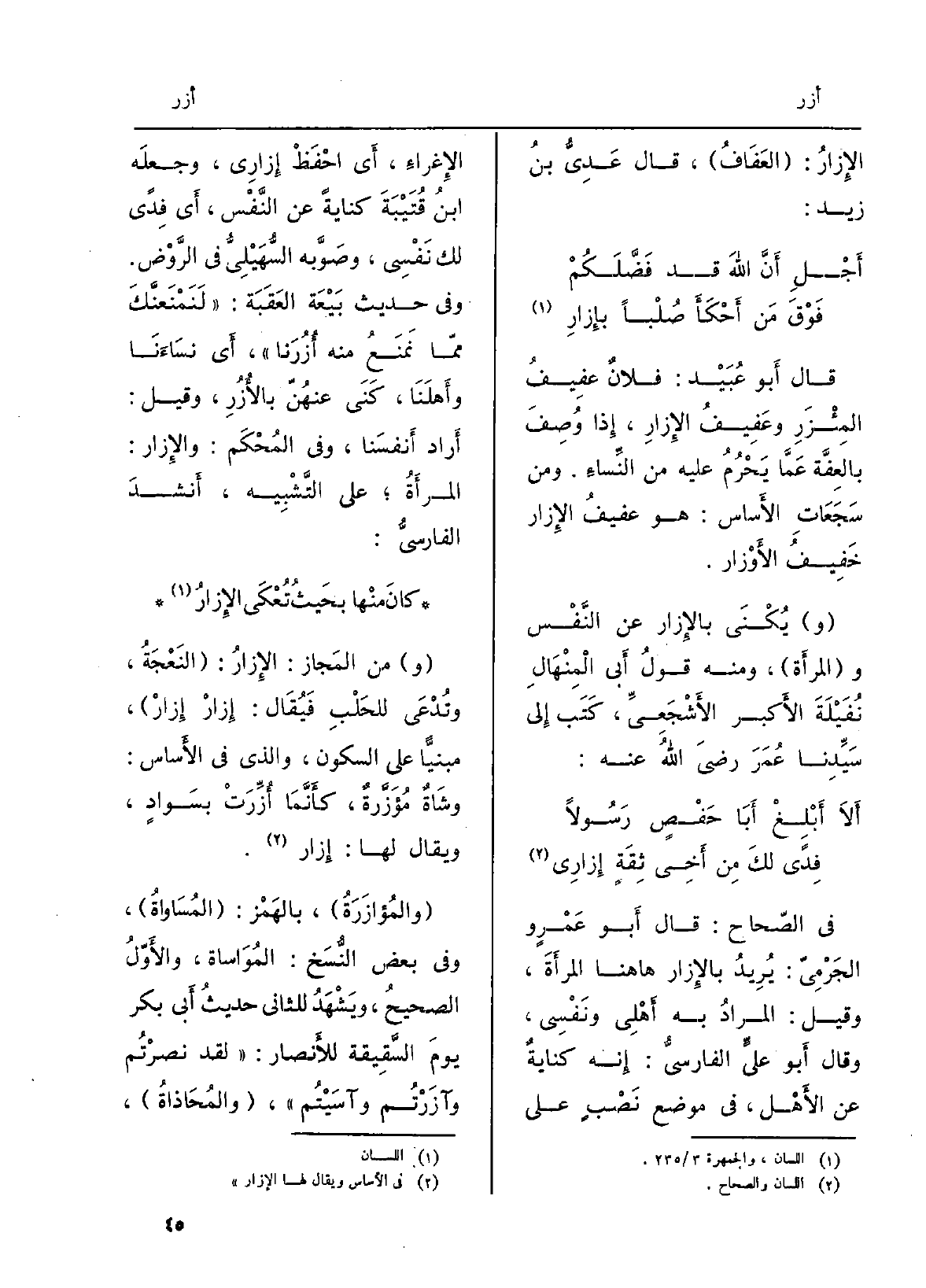 فِي الصّحاح: قَالَ أَبو عَمْرٍ والجَرْمِيّ: يُرِيدُ بالإِزار هَا هُنَا المرأَةَ، وَقيل: المرادُ بِهِ أَهْلِي ونَفْسِي، وَقَالَ أَبو عليَ الفارسيُّ: إِنه كنايةٌ عَن الأَهْل، فِي مَوضِع نَصْبٍ على الإِغراءِ، أَي احْفَظْ} - إِزارِي، وجعلَه ابنُ قُتَيْبَةَ كِنَايَة عَن النَّفْس، أَي فِدًى لَك نَفْسِي، وصَوَّبه السُّهَيْلِيُّ فِي الرَّوْض. وَفِي حَدِيث بَيْعَة العَقَبَة: (لَنَمْنَعنَّكَ ممّا نَمنَعُ مِنْهُ {أُزُرَنا) ، أَي نسَاءَنَا وأَهلَنَا، كَنَى عنهُنّ} بالأُزُرِ، وَقيل: أَراد أَنفسَنا، وَفِي المُحْكَم: {والإِزار: المرأَةُ؛ على التَّشْبِيه، أَنشدَ الفارسيُّ: