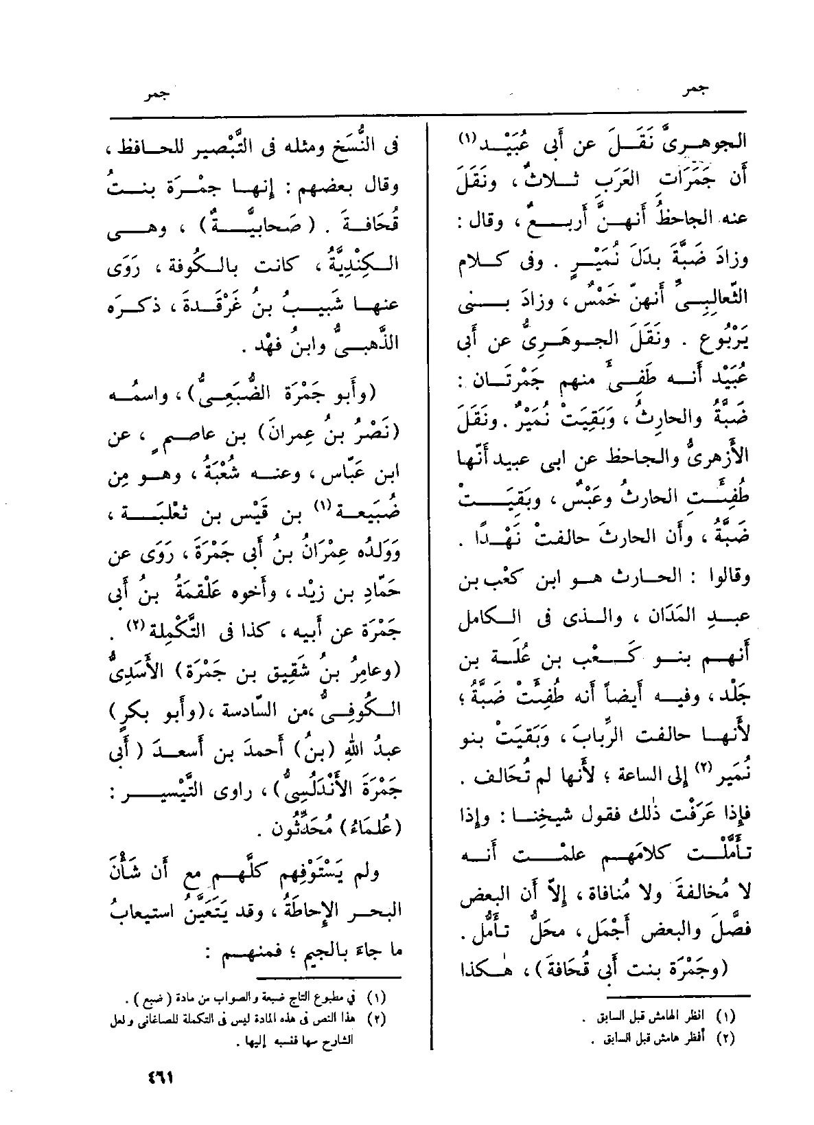 الجوهريَّ نَقَلَ عَن أَبي عُبَيْد أَن جَمَرَاتِ العَرَبِ ثلاثٌ، ونَقَلَ عَنهُ الجاحظُ أَنهنَّ أَربعٌ، وَقَالَ: وَزَاد، ضَبَّةَ بدَلَ نُمَيْرٍ. وَفِي كَلَام الثّعالِبِيِّ أَنهنّ خَمْسٌ، وزادَ بني يَرْبُوع. ونَقَلَ الجوهَرِيُّ عَن أَبي عُبَيْد أَنه طَفِيءَ مِنْهُم جَمْرتَان: ضَبَّةُ والحارِثُ، وَبَقِيَتْ نُمَيْرٌ. ونَقَلَ الأَزهريُّ والجاحظ عَن أبي عبيد أَنّها طُفِئَتِ الحارثُ وعَبْسٌ، وبَقِيَتْ ضَبَّةُ، وأَن الحارثَ حالفتْ نَهْداً. وَقَالُوا: الْحَارِث هُوَ ابْن كعْب بن عبدِ المَدَان، وَالَّذِي فِي الْكَامِل أَنهم بَنو كَعْب بن عُلَة بن جَلْد، وَفِيه أَيضاً أَنه طُفِئَتْ ضَبَّةُ؛ لأَنها حالفت الرِّبابَ، وَبَقيَتْ بَنو نُمَير إِلى السَّاعَة؛ لأَنها لم تُحَالف. فإِذا عَرَفْت ذالك فَقَوْل شيخِنا: وإِذا تأَمَّلْت كلامَهم علمْت أَنه لَا مُخالفةَ وَلَا مُنافاة، إِلّا أَن الْبَعْض فصَّلَ وَالْبَعْض أَجْمَل، محَلُّ تأَمُّل.