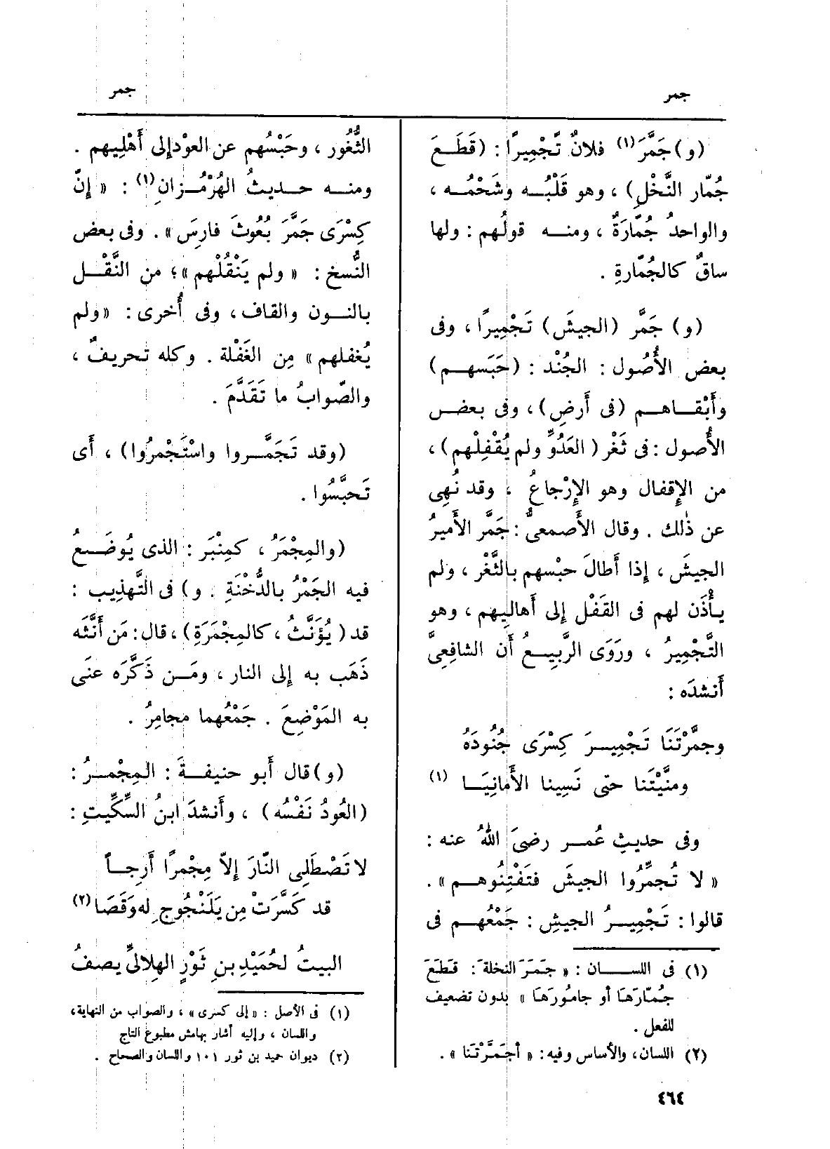 وَفِي حديثِ عُمر رضيَ اللهُ عَنهُ: (لَا تُجمِّرُوا الجيشَ فتَفْتِنُوهم) . قَالُوا: تَجْمِيرُ الجيشِ: جَمْعُهم فِي الثُّغُور، وحَبْسُه عَن العوْد إِلى أَهْلِيهم. وَمِنْه حديثُ الهُرْمُزانِ (إِنّ كِسْرَى جَمَّرَ بُعُوثَ فارِسَ) . وَفِي بعض النُّسخ: (وَلم يَنْقُلْهم) ؛ من النَّقْل بالنُّون وَالْقَاف، وَفِي أُخرى: (وَلم يُغفلهم) مِن الغَفْلة. وَكله تحريفٌ، والصّوابُ مَا تَقَدَّمَ.