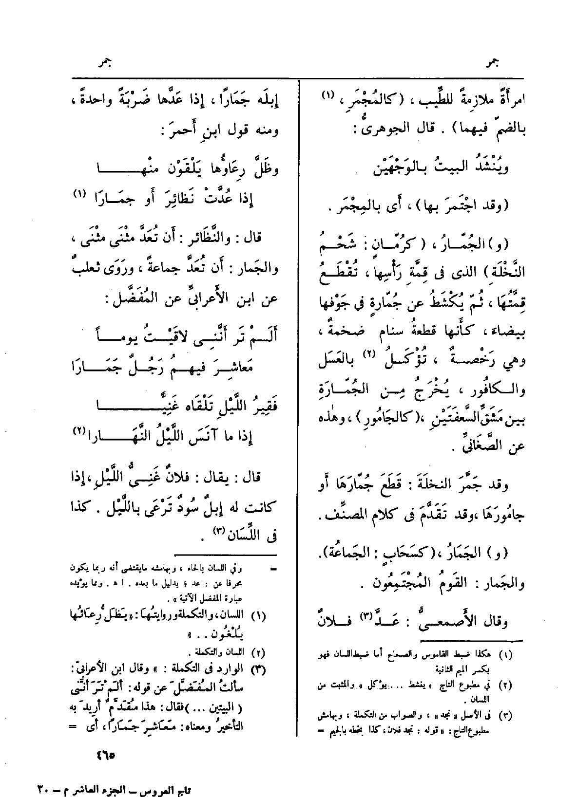 وَقَالَ الأَصمعيُّ: عَدَّ فلانٌ إِبلَه جماراً، إِذا عَدَّها ضَرْبَةٌ وَاحِدَة، وَمِنْه قَول ابنِ أَحمرَ: