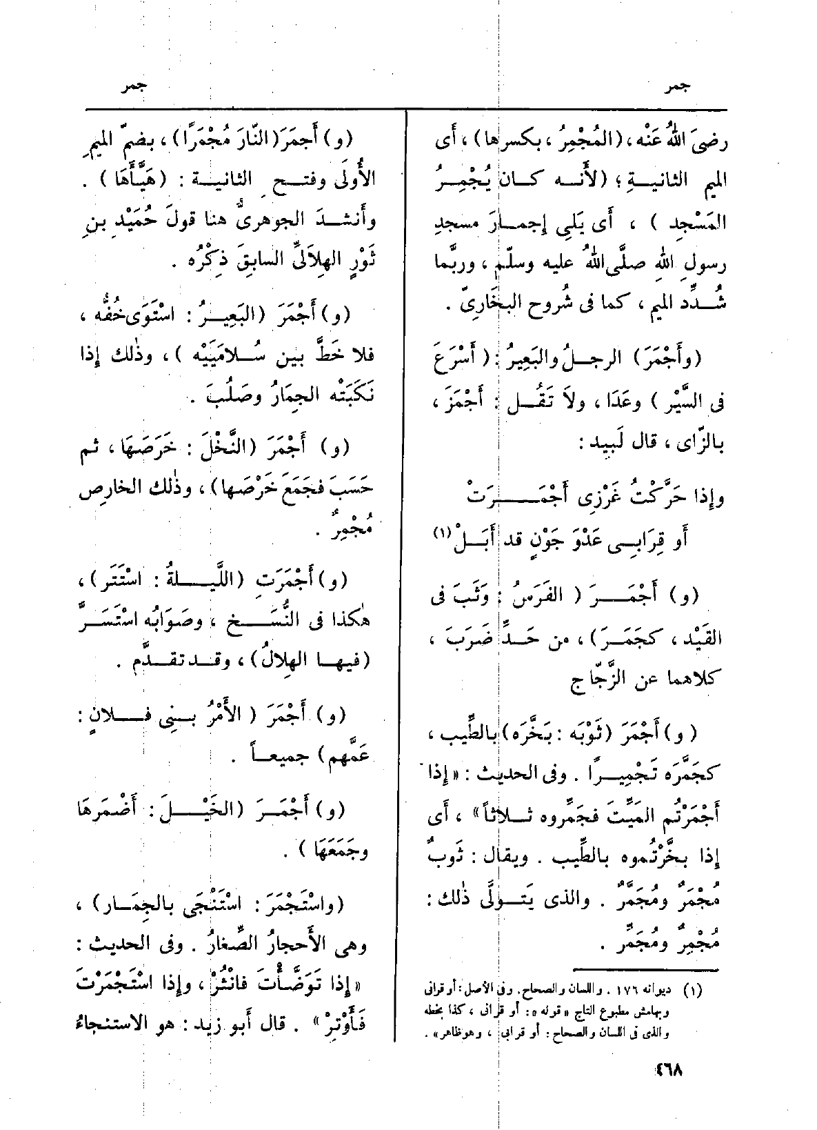 (و) أَجْمَرَ (البَعِيرُ: اسْتَوَى خُفُّه، فَلَا خَطَّ بَين سُلامَيَيْه) ، وذالك إِذا نَكَبَتْه الجِمارُ وصَلُبَ.