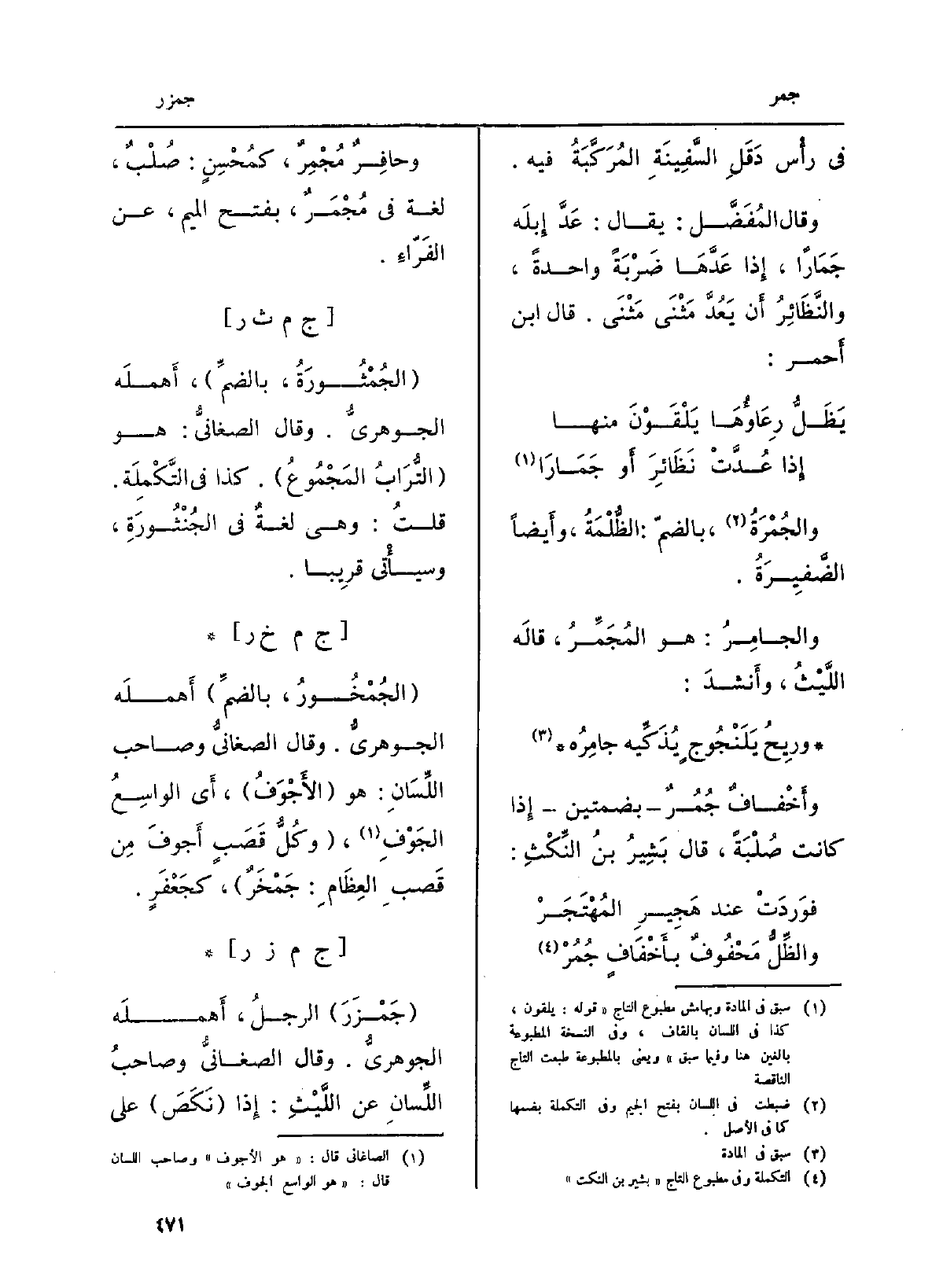 : (جَمْزَر) الرجلُ، أَهملَه الجوهريُّ. وَقَالَ الصغانيُّ صحبُ اللِّسانِ عَن اللَّيْثِ: إِذا (نَكَصَ) على