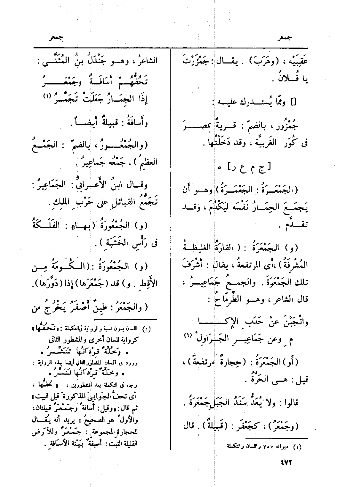 (و) الجَمْعَرَةُ: (القارَةُ الغليظةُ المُشْرِفَةُ) ، أَي المرتفعةُ، يُقَال: أَشْرَفَ تِلْكَ الجَمْعَرَةَ. والجمعُ جَمَاعِيرُ، قَالَ الشَّاعِر، وَهُوَ الطِّرِمّاحُ: