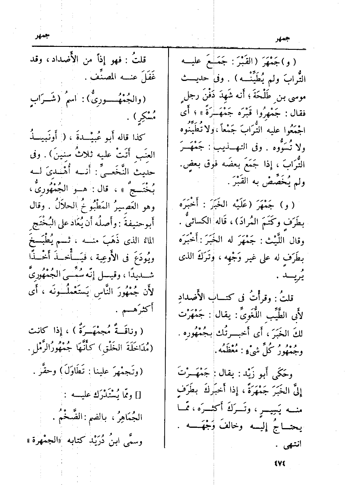 قلتُ: وقرأْتُ فِي كتاب الأَضدادِ لأَبي الطَّيِّبِ اللُّغَوِيِّ: يُقَال: جَمْهَرْت لكَ الخَبَرَ، أَي أَخبرتُك بجُمْهُورِه. وجُمْهُورُ كُلِّ شيْءٍ: مُعْظَمُه.