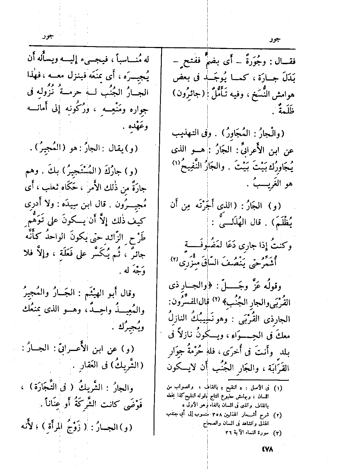 وقولُه عَزَّ وجَلّ: {} وَالْجَارِ ذِى الْقُرْبَى وَالْجَارِ الْجُنُبِ} (النِّسَاء: 36) قَالَ المفسِّرُون: الجارِذي القُرْبَى: وَهُوَ نَسِيبُكُ النازِلُ معكَ فِي الحِوَاءِ، ويكونُ نازلاً فِي بلدٍ وأَنتَ فِي أُخرَى، فَلهُ حُرْمةُ جِوَارِ القَرَابَة، والجَارِ الجُنُب أَن لَا يكون لَهُ مُناسباً، فَيَجِيء إِليه ويسأَله أَن {يُجِيرَه، أَي يمنَعَه فَينزل مَعَه، فهاذا الجارُ الجُنُب لَهُ حرمةُ نُزُولِه فِي} جِواره ومَنْعِهِ، ورُكُونِه إِلى أَمانه وعَهْدِه.