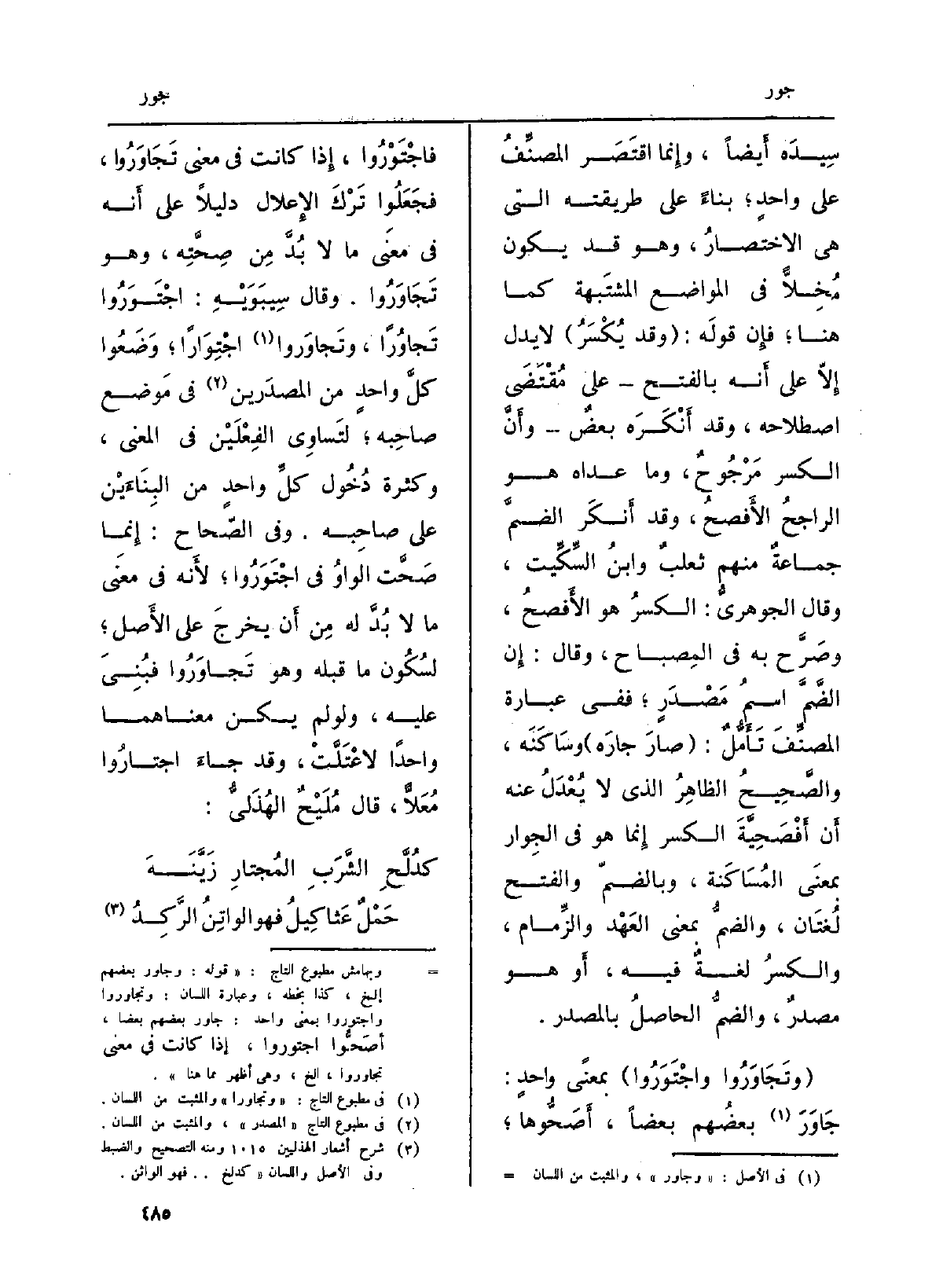 (} وتَجَاوَرُوا {واجْتَوَرُوا) بِمَعْنى واحدٍ:} جَاوَرَ بعضُهم بَعْضًا، أَصَحُّوها؛ {فاجْتوْرُوا، إِذا كَانَت فِي معنى} تَجَاوَرُوا، فجَعَلُوا تَرْكَ الإِعلال دَلِيلا على أَنه فِي معنَى مَا لَا بُدَّ مِن صِحَّتِه، وَهُوَ تَجَاوَرُوا. وَقَالَ سِيبَوَيْهِ: {اجُتَوَرُوا} تَجاوُراً، {وتَجاوَروا} اجْتِوَاراً؛ وَضَعُوا كلَّ واحدٍ من المصدَرين فِي مَوضع صاحِبه؛ لتَساوِي الفِعْلَيْن فِي الْمَعْنى، وَكَثْرَة دُخُول كلِّ واحدٍ من البِنَاءَيْن على صاحِبه. وَفِي الصّحاح: إِنما صَحَّت الواوُ فِي! اجْتَوَرُوا؛ لأَنه فِي معنَى مَا لَا بُدَّ لَهُ مِن أَن يخرجَ على الأَصل؛ لسُكُون مَا قبله وَهُوَ تَجاوَرُوا فبُنِيَ عَلَيْهِ، وَلَو لم يكن مَعْنَاهُمَا وَاحِدًا لاعْتَلَّتْ، وَقد جاءَ اجتارُوا مُعَلًّا، قَالَ مُلَيْحٌ الهُذَليُّ: