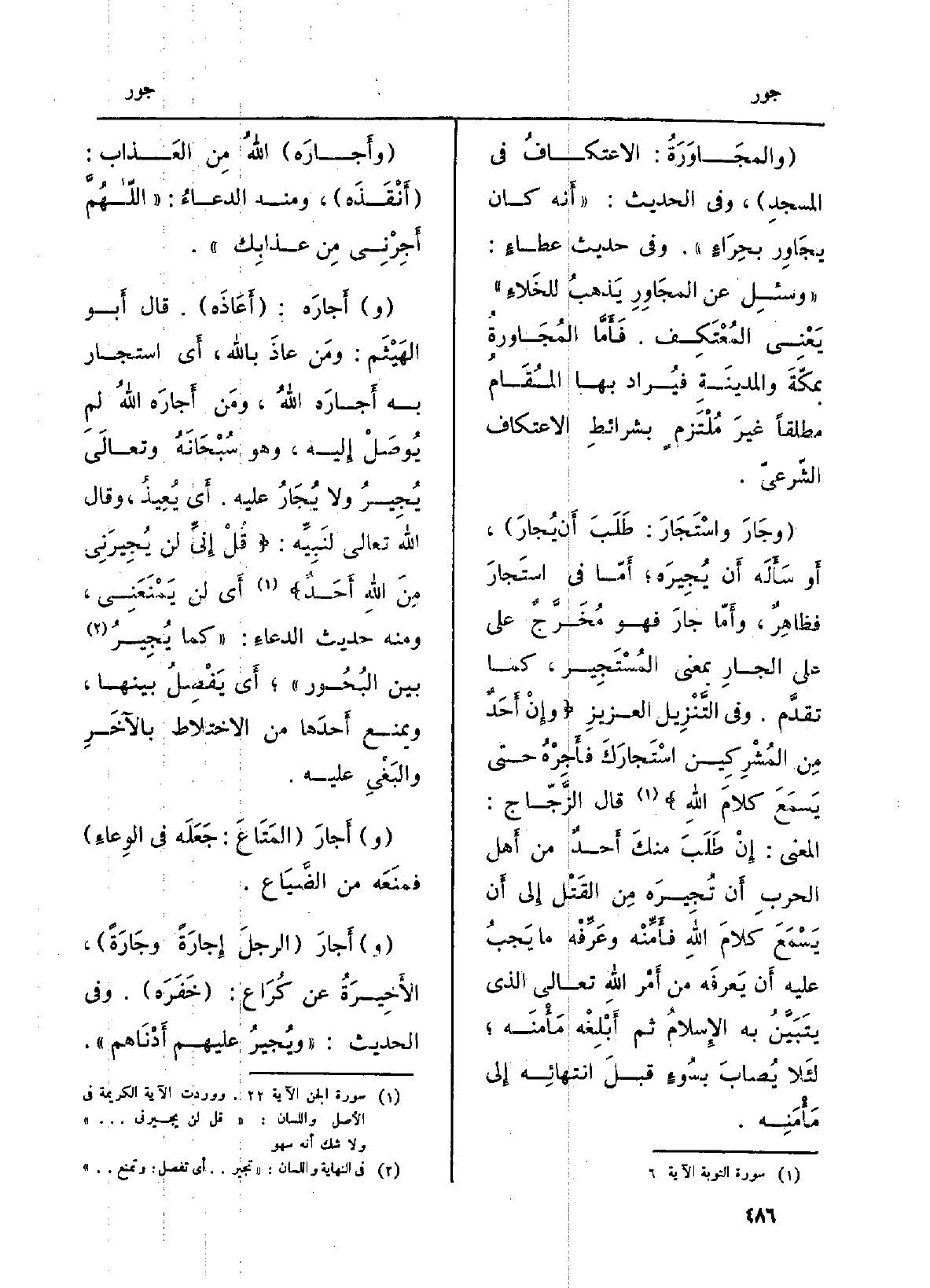 (} وجَارَ {واسْتَجَارَ: طَلَبَ أَن} يُجارَ) ، أَو سَأَلَه أَن {يُجِيرَه؛ أَمّا فِي} استَجارَ فظاهِرٌ، وأَمّا {جارَ فَهُوَ مُخَرَّجٌ على الجارِ بِمَعْنى} المُسْتَجِير، كَمَا تقدَّم. وَفِي التَّنْزِيل العزيزِ: {وَإِنْ أَحَدٌ مّنَ الْمُشْرِكِينَ {اسْتَجَارَكَ} فَأَجِرْهُ حَتَّى يَسْمَعَ كَلاَمَ اللَّهِ} (التَّوْبَة: 6) قَالَ الزَّجّاج: الْمَعْنى: إِنْ طَلَبَ منكَ أَحدٌ من أَهل الحربِ أَن {تُجِيرَه مِن القَتْل إِلى أَن يَسْمَعَ كلامَ اللهِ فأَمِّنْه وعَرِّفْه مَا يجبُ عَلَيْهِ أَن يَعرفَه من أَمْر اللهِ تَعَالَى الَّذِي يتَبَيَّنُ بِهِ الإِسلامُ ثمَّ أَبْلِغُه مَأْمنَ؛ لئَلا يُصابَ بسُوءٍ قبلَ انتهائِه إِلى مَأْمَنِه.