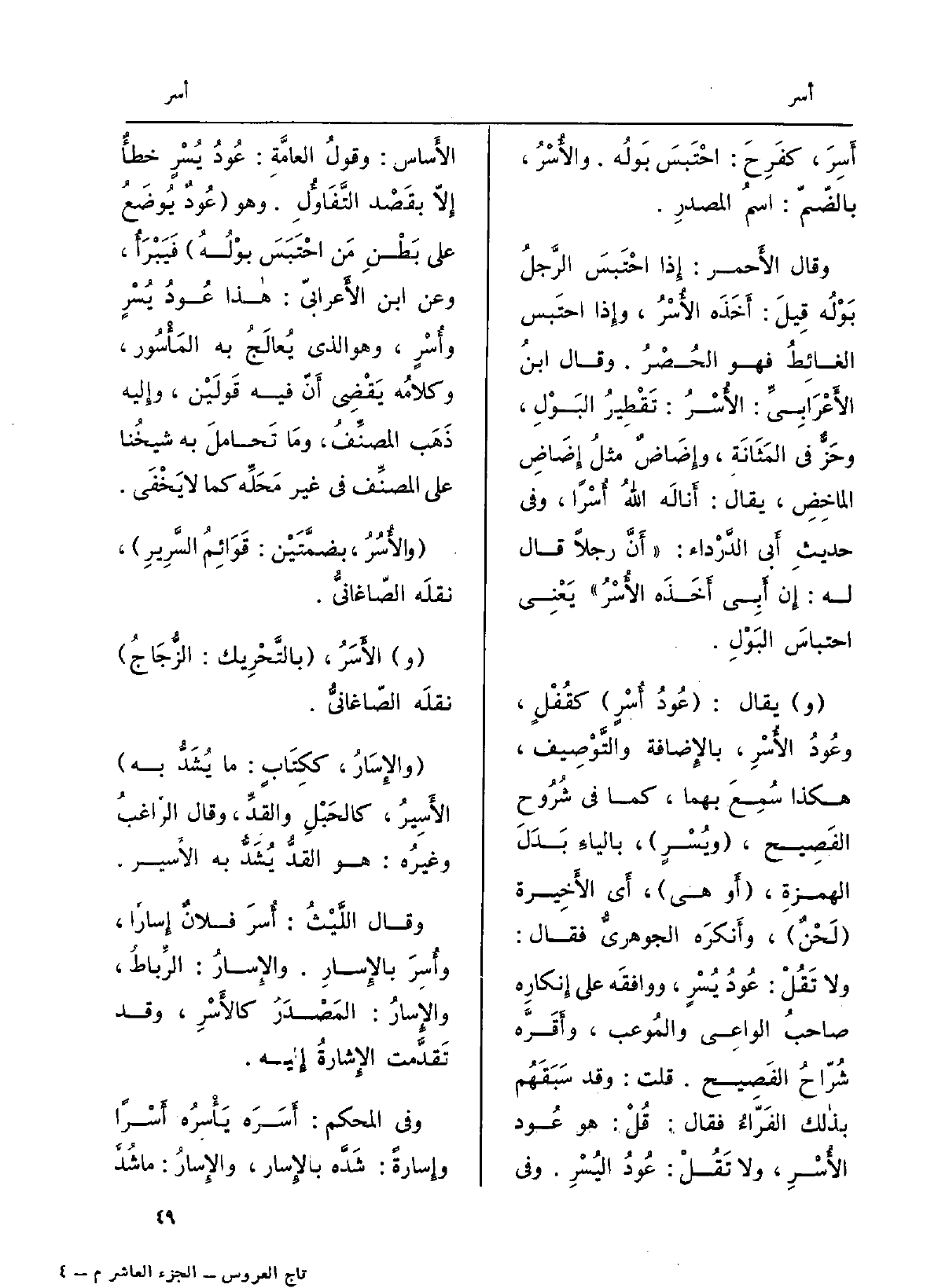 (و) يُقَال: (عُودُ} أُسْرٍ) كقُفْلٍ، وعُودُ {الأُسْرِ، بالإِضافة والتَّوْصِيف، هاكذا سُمِعَ بهما، كَمَا فِي شُرُوح الفَصِيح، (ويُسْرٍ) ، بالياءِ بَدَلَ الهمزةِ، (أَو هِيَ) ، أَي الأَخِيرة (لَحْنٌ) ، وأَنكرَه الجوهريُّ فَقَالَ: وَلَا تَقُلْ: عُودُ يُسْرٍ، ووافقَه على إِنكارِه صاحبُ الواعِي والمُوعب، وأَقَرَّه شُرّاحُ الفَصِيح. قلت: وَقد سَبَقَهُم بذالك الفَرّاءُ فَقَالَ: قُلْ: هُوَ عُود} الأُسْرِ، وَلَا تَقُلْ: عُودُ اليُسْرِ. وَفِي الأَساس: وقولُ العامَّةِ: عُودُ يُسْرٍ خطأٌ إِلّا بقَصْد التَّفَاؤُلِ. وَهُوَ (عُودٌ يُوضَعُ على بَطْنِ مَن احْتَبَسَ بوْلُهُ) فَيَبْرَأُ، وَعَن ابْن الأَعرابيّ: هاذا عُودُ يُسْرٍ {وأُسْرٍ، وَهُوَ الَّذِي يُعالَجُ بِهِ المَأْسُور، وكلامُه يَقْضِي أَنْ فِيهِ قَولَيْن، وإِليه ذَهَب المصنِّفُ، ومَا تَحاملَ بِهِ شيخُنا على المصنِّف فِي غير مَحَلِّه كَمَا لَا يَخْفَى.