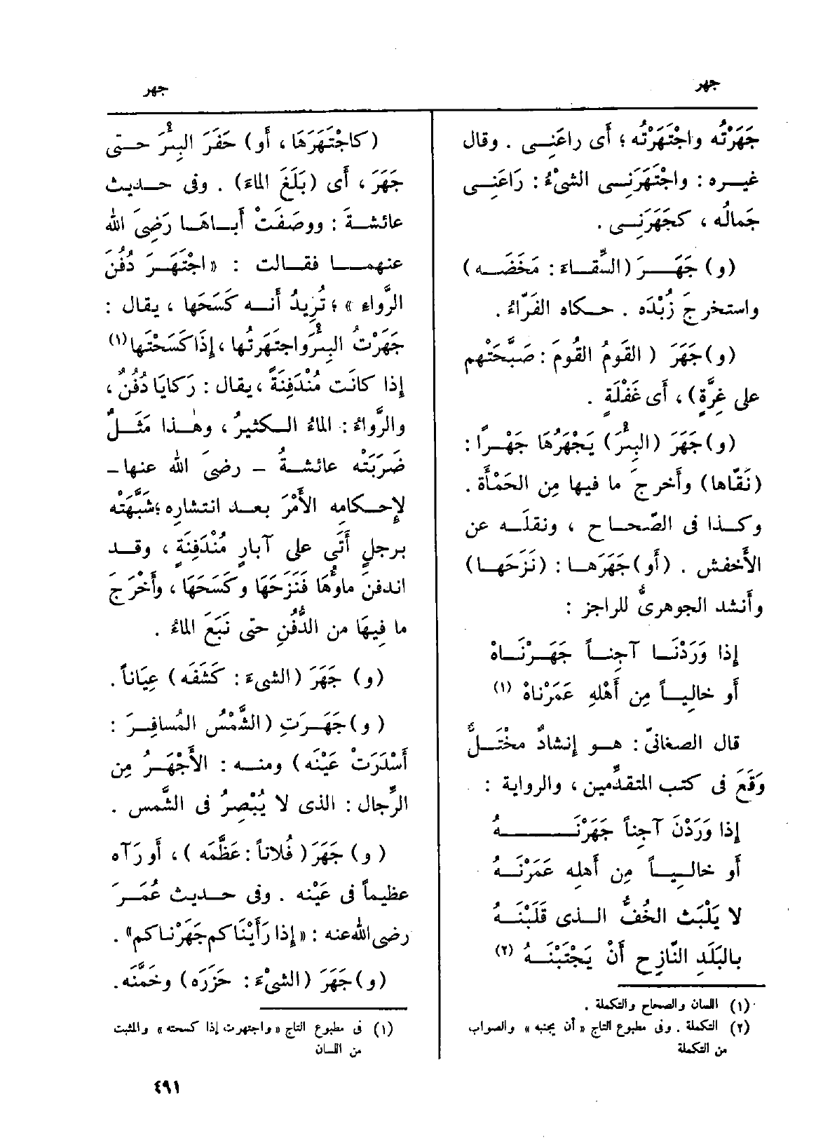 (كاجْتَهَرَهَا، أَو) حَفَرَ البِئْرَ حَتَّى جَهَرَ، أَي (بَلَغَ الماءَ) . وَفِي حَدِيث عائشةَ: ووصَفَتْ أَباهَا رَضِيَ الله عَنْهُمَا فَقَالَت؛ (اجْتَهَرَ دُفُنَ الرَّواءِ) ؛ تُرِيدُ أَنه كَسَحَها، يُقَال: جَهَرْتُ البِئْرَ واجتَهَرتُها، إِذَا كَسَحْتَها إِذا كانَت مُنْدَفِنَةً، يُقَال: رَكايَا دُفُنٌ، والرَّواءُ: الماءُ الكثيرُ، وهاذا مَثَلٌ ضَرَبَتْ عائشةُ رضيَ الله عَنْهَا لإِحكامِه الأَمْر بعد انتشارِه؛ شَبَّهَتْه برجلٍ أَتَى على آبارٍ مُنْدَفِنَةٍ، وَقد اندفنَ ماؤُهَا فَنَزَحَهَا وكَسَحَهَا، وأَخْرَجَ مَا فِيهَا من الدُّفُنِ حَتَّى نَبَعَ الماءُ.