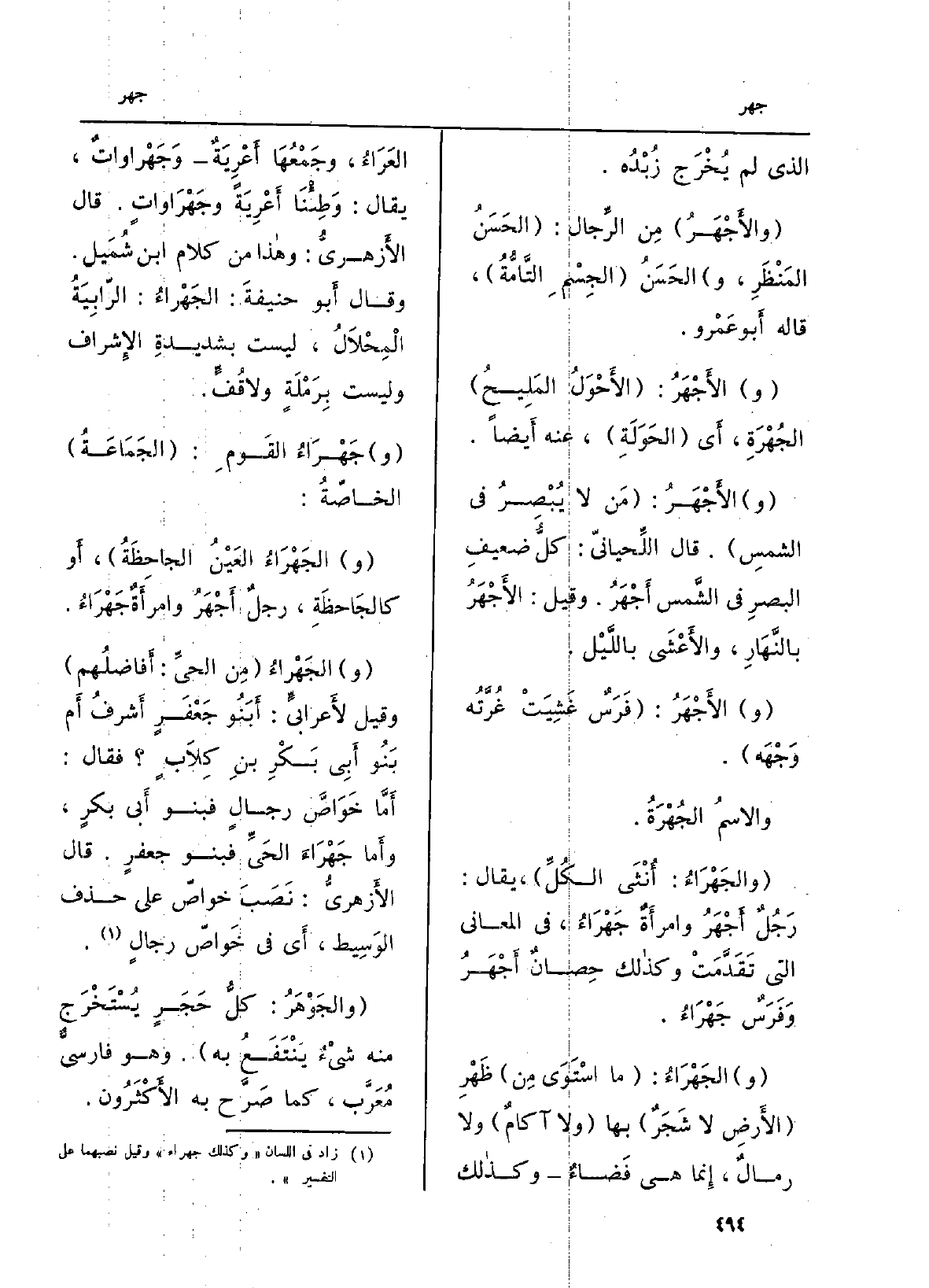 (و) الأَجْهَرُ: (مَن لَا يُبْصِرُ فِي الشمسِ) . قَالَ اللِّحيانيّ: كلُّ ضعيفِ البصرِ فِي الشَّمس أَجْهَرُ. وَقيل: الأَجْهَرُ بالنَّهَارِ، والأَعْشَى باللَّيْل.
