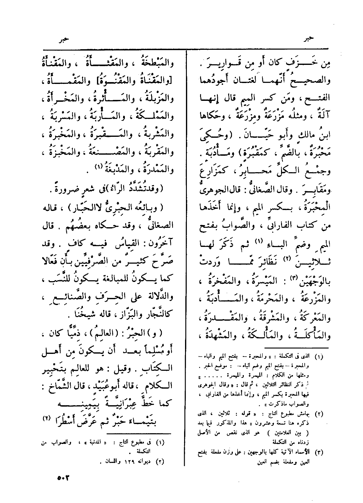 مِن خَزَفٍ كَانَ أَو مِن قَوارِيرَ. والصحيحُ أَنّهما لُغَتَانِ أَجودُهما الْفَتْح، ومَن كسر المِيم قَالَ إِنها آلَة، ومثلُه مَزْرَعَةٌ ومِزْرَعَةٌ، وحَكاها ابنُ مالكٍ وأَبو حَيّانَ. (وحُكِيَ مَحْبُرَةٌ، بالضَّمِّ، كمَقْبُرَةٍ) ومَأْدُبَةٍ. وجمْعُ الكلِّ مَحابِرُ، كمَزَارِعَ ومَقَابِرَ. وَقَالَ الصَّغانيُّ: قَالَ الجوهريُّ الْمِحْبَرَةُ، بِكَسْر الْمِيم، وإِنما أَخذَها من كتاب الفارابيِّ، والصَّوابُ بِفَتْح الميمِ وضمِّ الباءِ ثمَّ ذَكَرَ لَهَا ثلاثِينَ نَظَائِرَ ممّا وَردتْ بالوَجْهَيْن. المَيْسرَةُ، والمَفْخرَةُ، والمَزْرعَةُ، والمَحْرمَةُ، والمَأْدبَةُ، والمَعْركَةُ، والمَشْرقَةُ، والمَقْدرَةُ، والمَأْكلَةُ، والمَأْلكَةُ، والمَشْهدَةُ، والمَبْطخَةُ، والمَقْثأَةُ، والمَقْنأَةُ (والمَقْناةُ والمَقْنُوَةُ) والمَقْمأَةُ، والمَزْبلَةُ، والمَأْثرةُ، والمَخْرأَةُ، والمَمْلكَةُ، والمَأْربَةُ، والمَسْربَةُ، والمَشْربةُ، والمَقْبرَةُ، والمَخْبرَةُ، والمَقْربَةُ، والمَصْنعَةُ، والمَخْبزَةُ، والمَمْدرَةُ، والمَدْبغَةُ.