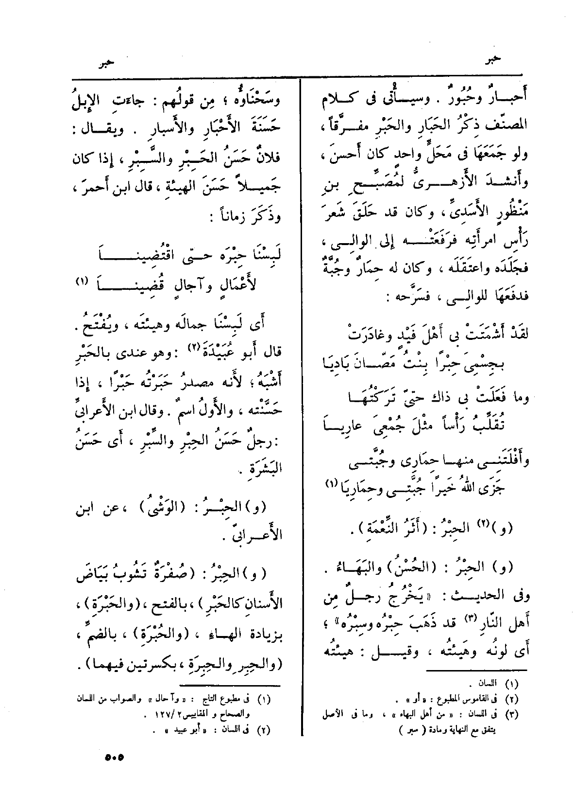 أَحبارٌ وحُبُورٌ. وسيأْتي فِي كَلَام المصنّف ذِكْرُ الحَبَارِ والحَبْرِ مفرَّقاً. وَلَو جَمَعَهَا فِي مَحَلَ واحدٍ كَانَ أَحسنَ، وأَنشدَ الأَزهريُّ لمُصَبِّحِ بنِ مَنْظُورٍ الأَسَدِيِّ، وَكَانَ قد حَلَقَ شعرَ رَأْسِ امرأَتِه فرَفَعَتْه إِلى الوالِي، فجَلَدَه واعتَقَله، وَكَانَ لَهُ حِمَارٌ وجُبَّةٌ فدفَعَهَا للوالِي، فسَرَّحه: