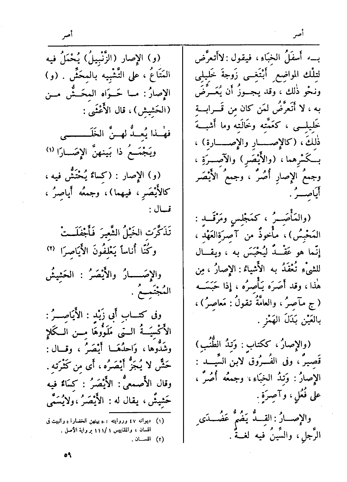 بِهِ أَسفَلُ الهبَاءِ، فَيَقُول: لَا أَتعرَّض لتِلْك المواضِعِ أَبْتَغِي زَوجةَ خَلِيلي ونحْو ذالك، وَقد يجوزُ أَن يُعَرِّضَ بِهِ، لَا أَتَعرَّضُ لمَن كَانَ مِن قَرابةِ خَلِيلِي، كعَمَّتِه وخَالَتِه وَمَا أَشبهَ ذالِكَ، ( {كالإِصارِ} والإِصارةِ) ، بكَسْرِهما، ( {والأَيْصَرِ) } والآصِرَةِ، وجمعُ {الإِصارِ} أُصُرٌ، وجمعُ {الأَيْصَر} أَيَاصِرُ.