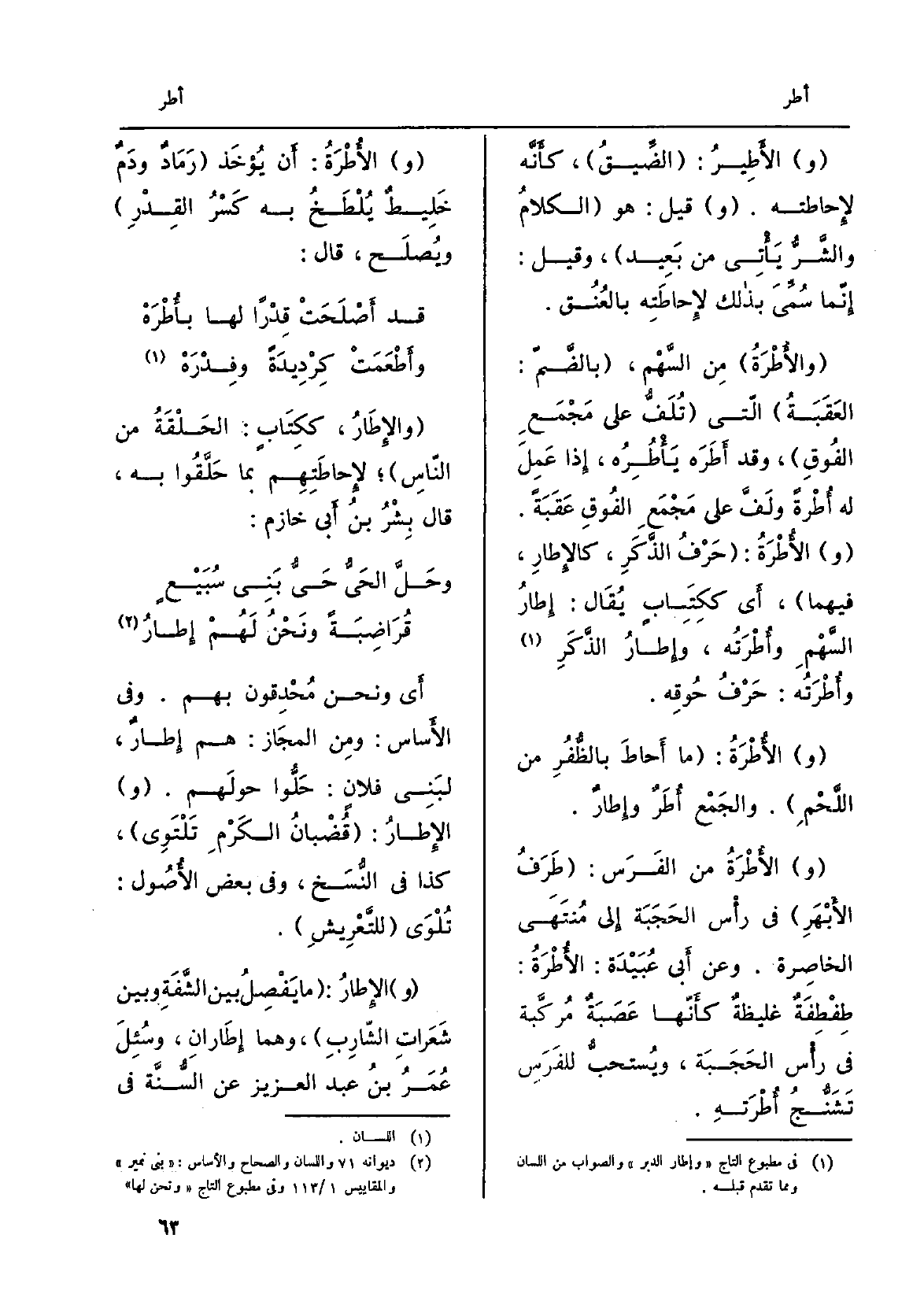 (و) الإِطارُ: (مَا يَفْصِلُ بَين الشَّفَةِ وَبَين شَعَراتِ الشّارِبِ) ، وهما! إِطَارانِ. وسُئِلَ عُمَرُ بنُ عبد الْعَزِيز عَن السُّنَّة فِي