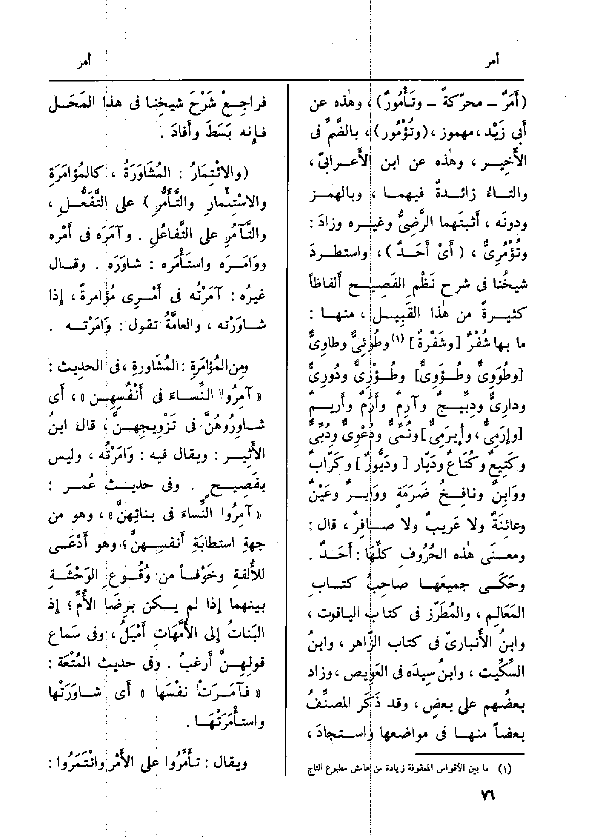 ومِن} المُؤامَرةِ: المُشَاورةِ، فِي الحدِيث: ( {آمِرُوا النِّساءَ فِي أَنْفُسِهِن) ، أَي شاوِرُوهُنَّ فِي تَزْوِيجِهْنَّ، قَالَ ابنُ الأَثِير: وَيُقَال فِيهِ: وَأمَرْتُه، وَلَيْسَ بفَصِيحٍ. وَفِي حَدِيث عُمر: (} آمِرُوا النِّساءَ فِي بناتِهنَّ) ، وَهُوَ من جهةِ استطابَةِ أَنفسِهنَّ؛ وَهُوَ أَدْعَى للأُلفةِ وخَوْفاً من وُقُوعِ الوَحْشَةِ بَينهمَا إِذا لم يكن برِضَا الأُمِّ؛ إِذ البَناتُ إِلى الأُمَّهَاتِ أَمْيَلُ، وَفِي سَماع قولِهِنَّ أَرغبُ. وَفِي حَدِيث المُتْعَة: ( {فآمَرَتْ نفْسَها) أَي شاوَرَتْها واستأْمَرَتْهَا.