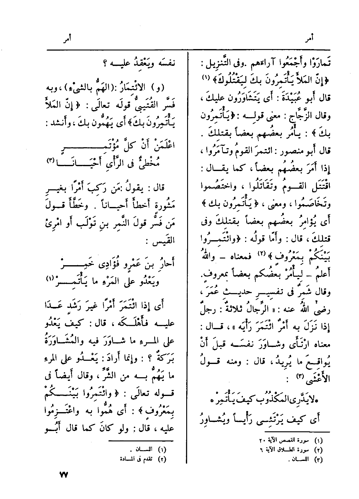 تَمارَوْا وأَجْمَعُوا آراءَهم. وَفِي التَّنزِيل: {إِنَّ الْمَلاَ {يَأْتَمِرُونَ بِكَ لِيَقْتُلُوكَ} (الْقَصَص: 20) قَالَ أَبو عُبَيْدَةَ: أَي يَتَشَاوَرُون عليكَ، وَقَالَ الزَّجَّاج: معنى قولِه: {يَأْتَمِرُونَ بِكَ} : يأْمُر بعضُهم بَعْضًا بقتلِكَ. قَالَ أَبو مَنْصُور:} ائتمرَ القومُ {وتآمَرُوا، إِذا أَمَرَ بعضُهُم بَعْضًا، كَمَا يُقَال: اقْتَتَل القومُ وتَقَاتَلُوا، اختَصُموا وتَخَاصَمُوا، وَمعنى، {يأتمرون بك} أَي} يؤُامِرُ بعضُهم بَعْضًا بقتلِكَ وَفِي قتلِكَ، قَالَ: وأَمّا قولُه: { {وائْتَمِرُواْ بَيْنَكُمْ بِمَعْرُوفٍ} (الطَّلَاق: 6) فَمَعْنَاه واللهُ أَعلمُ} لِيأْمُرْ بعضُكم بَعْضًا بمعروفٍ. وَقَالَ شَمِرٌ فِي تفسِيرِ حديثِ عُمَرَ، رَضِي اللهُ عَنهُ: (الرِّجالُ ثلاثةٌ: رجلٌ إِذا نَزَلَ بِهِ أَمْرٌ {ائْتَمَرَ رَأْيَه) ، قَالَ: مَعْنَاهُ ارْتَأَى وشاوَرَ نفسَه قبلَ أَنْ يُواقِعَ مَا يُرِيدُ، قَالَ: وَمِنْه قولُ الأَعْشَى: