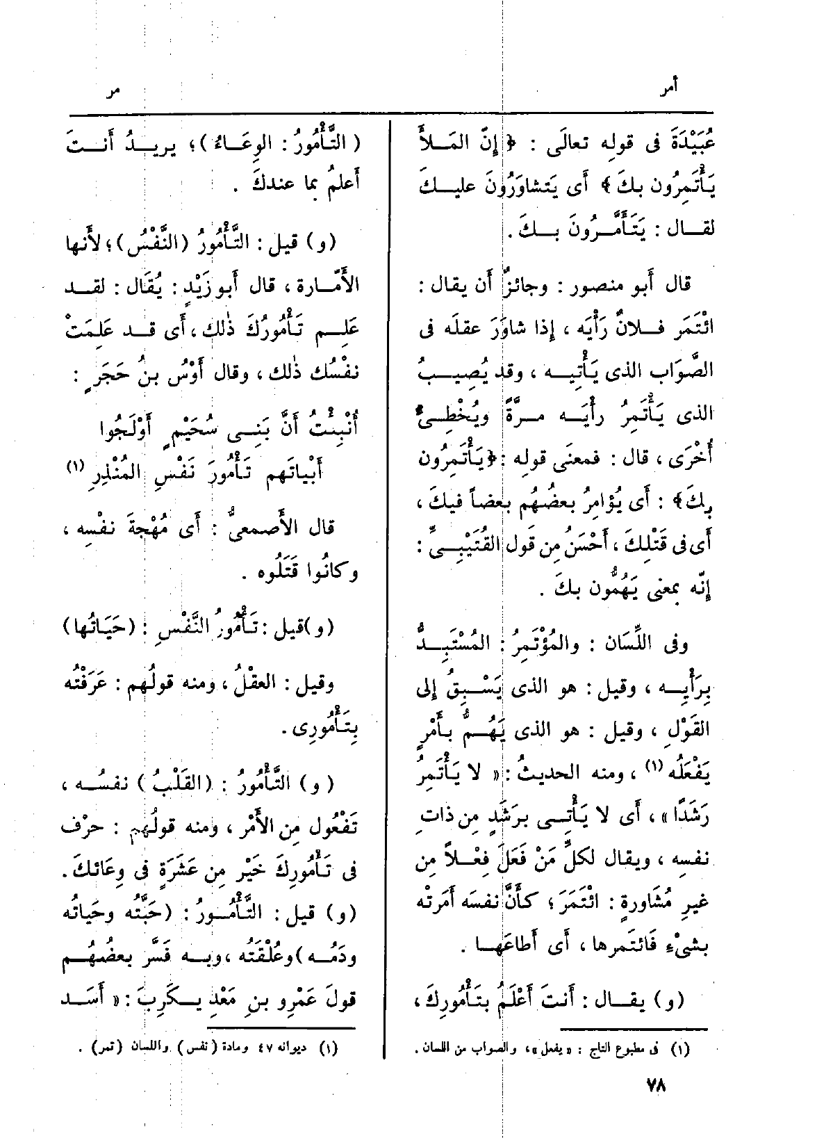 عُبَيْدَةَ فِي قولِه تعالَى: {إِنَّ الْمَلاَ {يَأْتَمِرُونَ بِكَ} أَي يَتشاوَرُونَ عليكَ لقَالَ:} يَتأَمَّرُون بكَ.