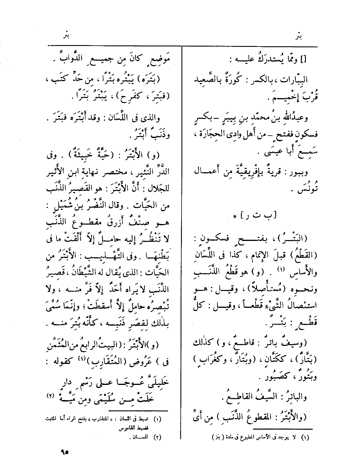 بتر: (البَتْرُ) ، بفتحٍ فسكونٍ: (القَطْعُ) قبلَ الإِتمام، كَذَا فِي اللِّسَانِ والأَساسِ. (و) هُوَ قَطْعُ الذَّنَبِ ونحوِه (مُستأْصِلاً) ، وَقيل: هُوَ استئصالُ الشَّيْءِ قَطْعاً، وَقيل: كلُّ قطْعٍ: