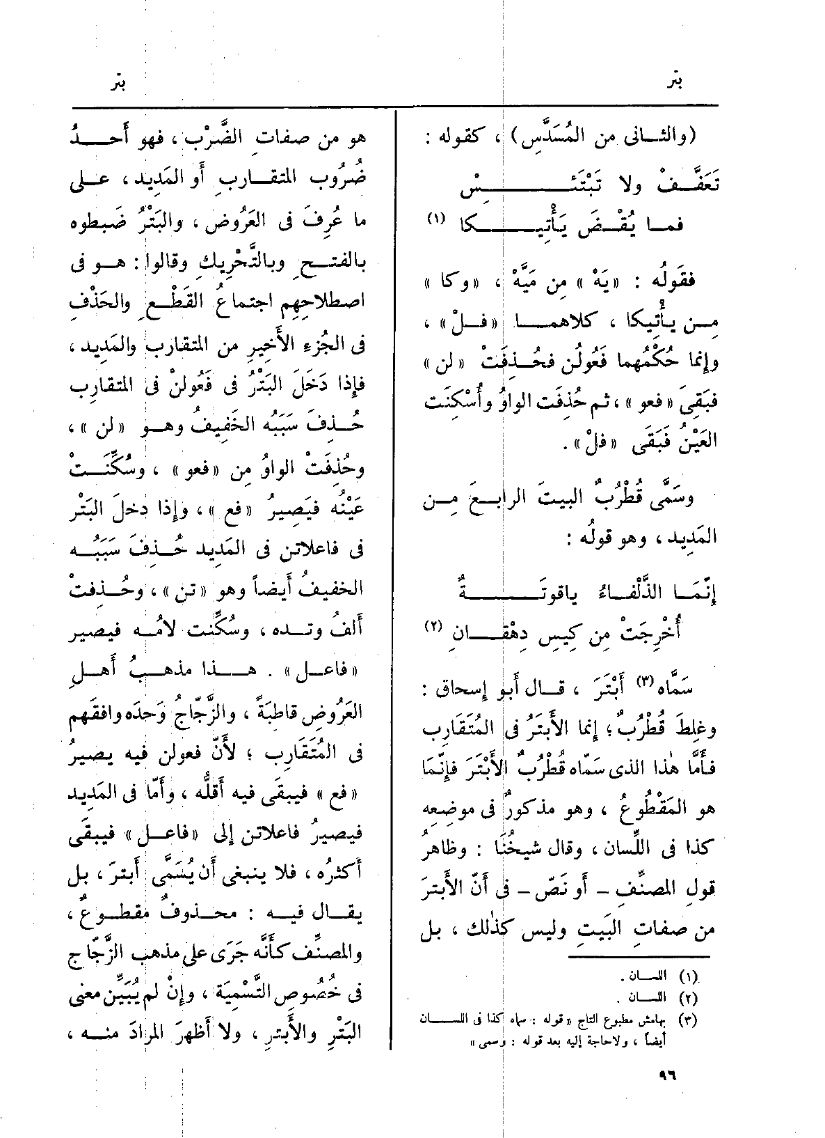 سَمَّاه أَبْتَرَ، قَالَ أَبو إِسحاق: وغلِطَ قُطْرُبٌ؛ إِنما الأَبتَرُ فِي المُتَقَارِب فأَمَّا هاذا الَّذِي سَمّاه قُطْرُبٌ الأَبْتَرَ فإنّمَا هُوَ المَقْطُوعُ، وَهُوَ مذكورٌ فِي موضِعِه كَذَا فِي اللِّسان، وَقَالَ شيخُنَا: وظاهرُ قولِ المصنِّفِ أَو نَصّ فِي أَنّ الأَبترَ من صفاتِ البَيتِ وَلَيْسَ كذالك، بل هُوَ من صفاتِ الضَّرْب، فَهُوَ أَحدُ ضُرُوب المتقاربِ أَو المَدِيد، على مَا عُرِفَ فِي العَرُوض، والبَتْرُ ضَبطوه بالفتحِ وبالتَّحْرِيكِ وَقَالُوا: هُوَ فِي اصطلاحِهِم اجتماعُ القَطْعِ والحَذْفِ فِي الجُزءِ الأَخِيرِ من المتقارب والمَدِيد، فإِذا دَخَلَ البَتْرُ فِي فَعُولنْ فِي المتقارِب حُذِفَ سَبَبُه الخَفِيفُ وَهُوَ (لن) ، وحُذِفَتْ الواوُ مِن (فعو) ، وسُكِّنَتْ عَيْنُه فيَصِيرُ (فع) ، وإِذا دخلَ البَتْر فِي فاعلاتن فِي المَدِيد حُذِفَ سَبَبُه الخفيفُ أَيضاً وَهُوَ (تن) ، وحُذِفتْ أَلفُ وتده، وسُكِّنت لامُه فَيصير (فَاعل) . هَذَا مذهبُ أَهلِ العَرُوضِ قاطِبَةً، والزَّجّاجُ وَحدَه وافقَهم فِي المُتقَارِب؛ لأَنّ فعولن فِيهِ يصيرُ (فع) فيبقَى فِيهِ أَقلُّه، وأَمّا فِي المَدِيد فيصيرُ فاعلاتن إِلى (فَاعل) فيبقَى أَكثرُه، فَلَا يَنْبَغِي أَن يُسَمَّى أَبترَ، بل يُقَال فِيهِ: محذوفٌ مقطوعٌ، والمصنِّف كأَنَّه جَرَى على مَذْهَب الزَّجّاج فِي خُصُوص التَّسْمِيَة، وإِنْ لم يُبَيِّن معنى البَتْرِ والأَبترِ، وَلَا أَظهرَ المرادَ مِنْهُ،