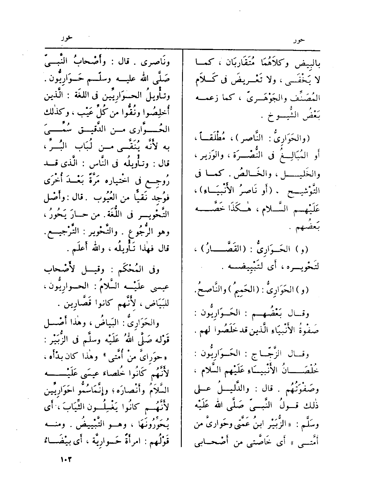 وَقَالَ الزَّجّاج: الحَوَارِيُّون: خُلْصَانُ الأَنْبيَاءِ عَلَيْهم السَّلاام، وصَفْوَتُهُم. قَالَ: والدَّليلُ على ذالك قولُ النَّبيّ صلى الله عَلَيْهِ وَسلم (الزّبَيْر ابنُ عَمَّتي} - وحَواريَّ من أُمَّتي) أَي خَاصَّتي من أَصْحابي ونَاصري. قَالَ: وأَصْحَابُ النَّبيّ صلى الله عَلَيْهِ وَسلم حَوَارِيُّون. وتأْوِيلُ {الحوَارِيِّين فِي اللغَة: الَّذين أُخلِصُوا ونُقُّوا عَن كُلِّ عَيْب، وكذالك} الحُوَّاري من الدَّقيق سُمِّيَ بِهِ لأَنَّه يُنَقَّى من لُبَاب البُرِّ، قَالَ: وتأْويلُه فِي النَّاس: الَّذي قد رُوجِع فِي اخْتياره مَرَّةً بَعْدَ أُخْرَى فوُجِد نَقيًّا من العُيُوب. قَالَ: وأَصْل {التَّحْوير فِي اللُّغَة. من} حَار {يَحُورُ، وَهُوَ الرُّجُوع.} والتَّحْوير: التَّرْجيع. قَالَ فهاذا تَأْويلُه، وَالله أعلَم.