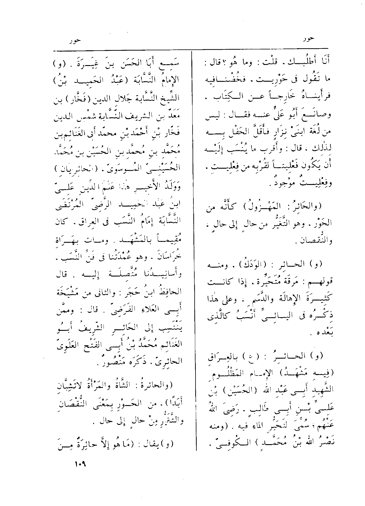 (و) الحائِرُ: (ع) بالعِرَاقِ (فِيهِ مَشْهَدُ) الإِمام المَظْلُومِ الشَّهِيدِ أَبِي عَبْدِ الله (الحُسَيْن) بْن عَلِيِّ بْنِ أَبِي طَالِبٍ. رَضِيَ اللَّهُ عَنْهُم؛ سُمِّيَ} لتَحَيُّرِ الماءِ فِيهِ. (وَمِنْه نَصْرُ الله بْنُ مُحَمَّدٍ) الكُوفِيّ، سَمِعَ أَبَا الحَسَن بنَ غِيَرَةَ. (و) الإِمَامُ النَّسَّابَة (عَبْدُ الحَمِيد بْنُ) الشِّيخ النَّسَّابة جَلالِ الدّين (فَخَّار) بن مَعَدّ بن الشريف النّسَّابة شمْس الدّين فَخّار بْنِ أَحْمَد بْنِ محمّد أبي الغَنَائِم بن مُحَمَّدِ بنِ مُحمَّدِ بنِ الحُسَيْن بن مُحَمَّد الحُسَيْنِيّ المُوسَويّ، ( {الحائِرِيانِ) وَوَلَدُ الأَخِيرِ هاذا عَلَمُ الدِّينِ عَلَيّ ابنُ عَبْد الحَمِيد الرَّضِيّ المُرْتَضَى النَّسَّابَة إِمَامُ النَّسَب فِي العِراق، كَانَ مُقِيماً بالمَشْهَد. وَمَات بهَرَاةِ خُرَاسَان، وَهُوَ عُمْدَتُنا فِي فَنِّ النَّسَب، وأَسانِيدُنا مُتَّصِلَة إِليه. قَالَ الحافِظُ ابنُ حَجَر: وَالثَّانِي من مَشْيَخَة أَبي العَلاءِ الفَرَضِيّ. قَالَ: وممَّن يَنْتَسِب إِلى الحَائِرِ الشّريفُ أَبُو الغَنَائِم مُحَمَّدُ بْنُ أَبِي الفَتْح العَلَوِيّ} - الحائِرِيّ، ذَكَرَه مَنْصُورٌ.