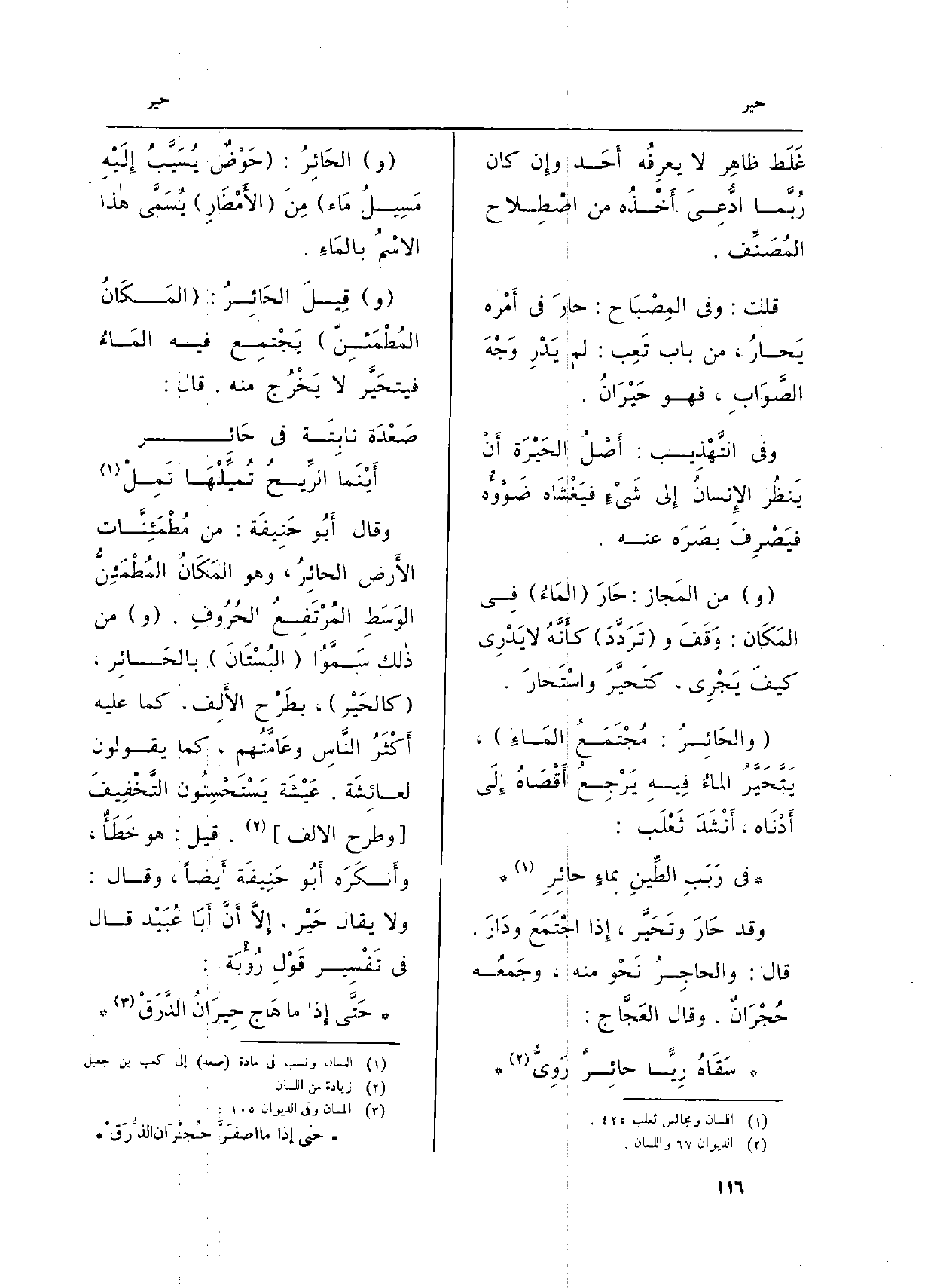 وَقَالَ أَبُو حَنِيفَة: من مُطْمَئِنَّات الأَرض الحائِرُ، وَهُوَ المَكَانُ المُطْمَئِن الوَسَطِ المُرْتَفِعُ الحُرُوفِ. (و) من ذالك سَمَّوُا (البُسْتَانَ) {بالحَائِر، (} كالحَيْر) ، بطَرْح الأَلف، كَمَا عَلَيْهِ أَكْثَرُ النَّاسِ وعَامَّتُهم، كَمَا يَقُولُونَ لعائِشَة. عَيْشَة يَسْتَحْسِنُون التَّخْفِيفَ (وَطرح الأَلف) . قيل: هُوَ خَطَأٌ، وأَنكَرَه أَبُو حَنِيفَة أَيضاً، وَقَالَ: وَلَا يُقَال حَيْر، إِلاَّ أَنَّ أَبَا عُبَيْد قَالَ فِي تَفْسِير قَوْلِ رُؤْبَة: