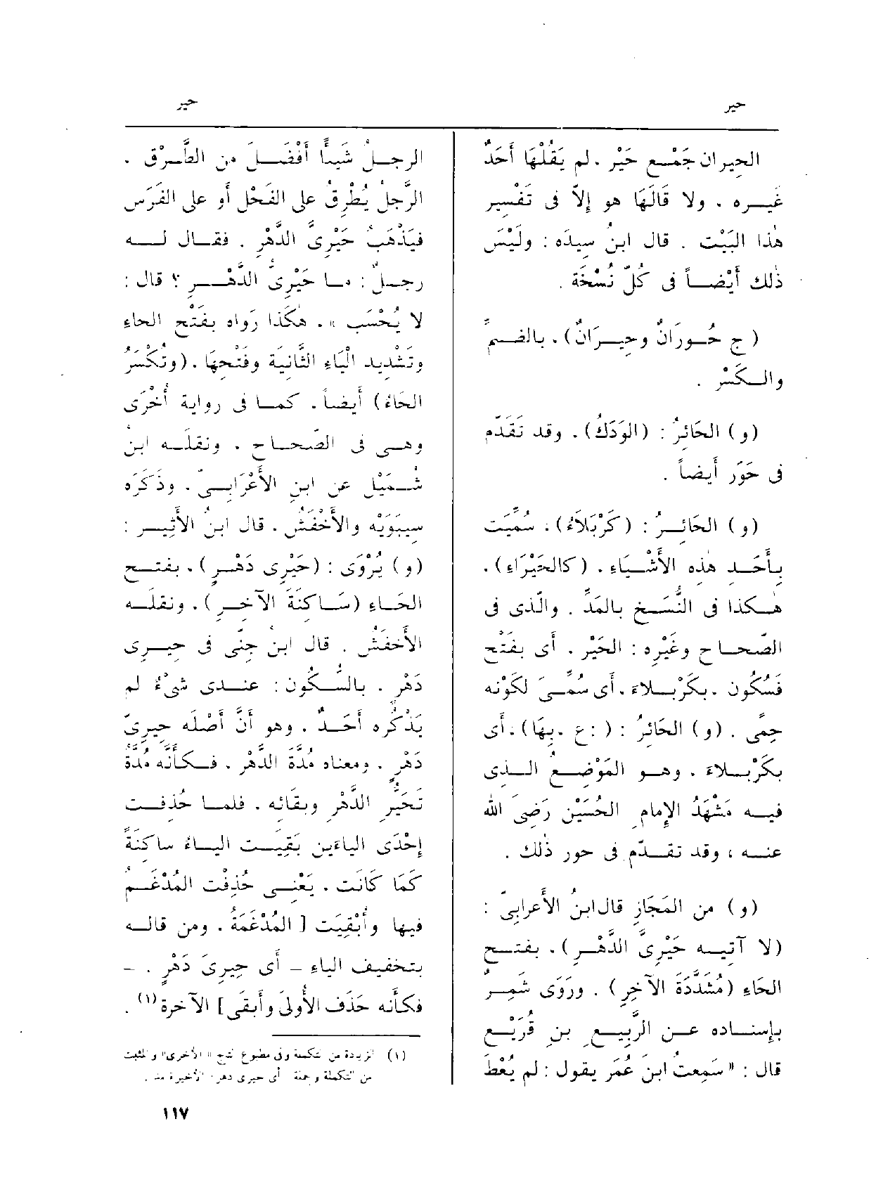 {الحِيران جَمْع} حَيْر، لم يَقُلْهَا أَحَدٌ غَيره، وَلَا قَالَهَا هُوَ إِلاّ فِي تَفْسِير هاذا البَيْت. قَالَ ابنُ سِيدَه: ولَيْسَ ذالك أَيْضاً فِي كُلّ نُسْخَة.