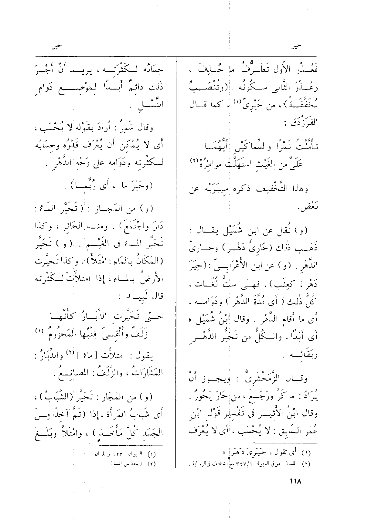 وَقَالَ الزَّمَخْشَرِيُّ: وَيجوز أَنْ يُرَدَا: مَا كَرَّ ورَجَعَ، مِن حَارَ يَحُورُ. وَقَالَ ابْنُ الأَثِير فِي تَفْسِير قَوْلِ ابْنِ عُمَر السُّابِق: لَا يُحْسَب، أَي لَا يُعْرَف حِسَابُه لكَثْرَتِه، يريدأَنّ أَجْرَ ذالك دائِمٌ أَبداً لِمَوْضِع دَوامِ النَّسْلِ.