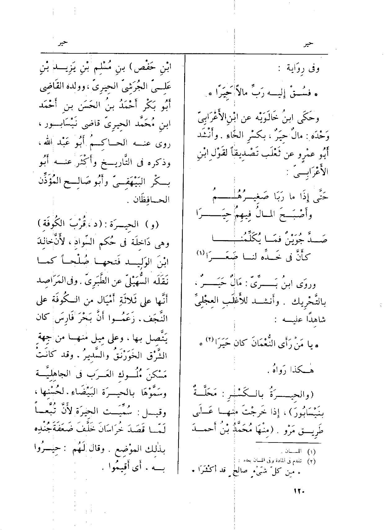 (و) } الحِيرَة: (د، قُرْبَ الكُوفَةِ) وَهِي دَاخِلَة فِي حُكم السّوادِ، لأَنَّ خَالِدَ ابْنَ الوَلِيد فَتحها صُلْحاً كَمَا نَقَلَه السُّهَيْليّ عَن الطَّبَرِيّ. وَفِي المَرَاصِد أَنَّها على ثَلاثَةِ أَمْيَال من الكُوفَة على النَّجَف. زَعَمُوا أَنَّ بَحآَ فَارِسَ كَانَ يَتَّصِل بهَا، وعَلى مِيل مِنْهَا من جِهةِ الشَّرْق الخَوَرْنَقُ والسَّدِيرُ، وَقد كانَتْ مَسْكنَ مُلْوكِ العَرَب فِي الجاهِليَّة وسَمَّوْهَا بالحيرَة البَيْضَاءِ، لحُسْنها، وَقيل: سُمِّيَت الحِيرَة لأَنَّ تُبَّعاً لَمّا قَصَدَ خُرَاسَانَ خَلَّفَ ضَعَفَةَ جُنْدِه بذالِك الموْضِع. وَقَالَ لَهُم: حِيرُوا بِهِ، أَي أَقِيمُوا.
