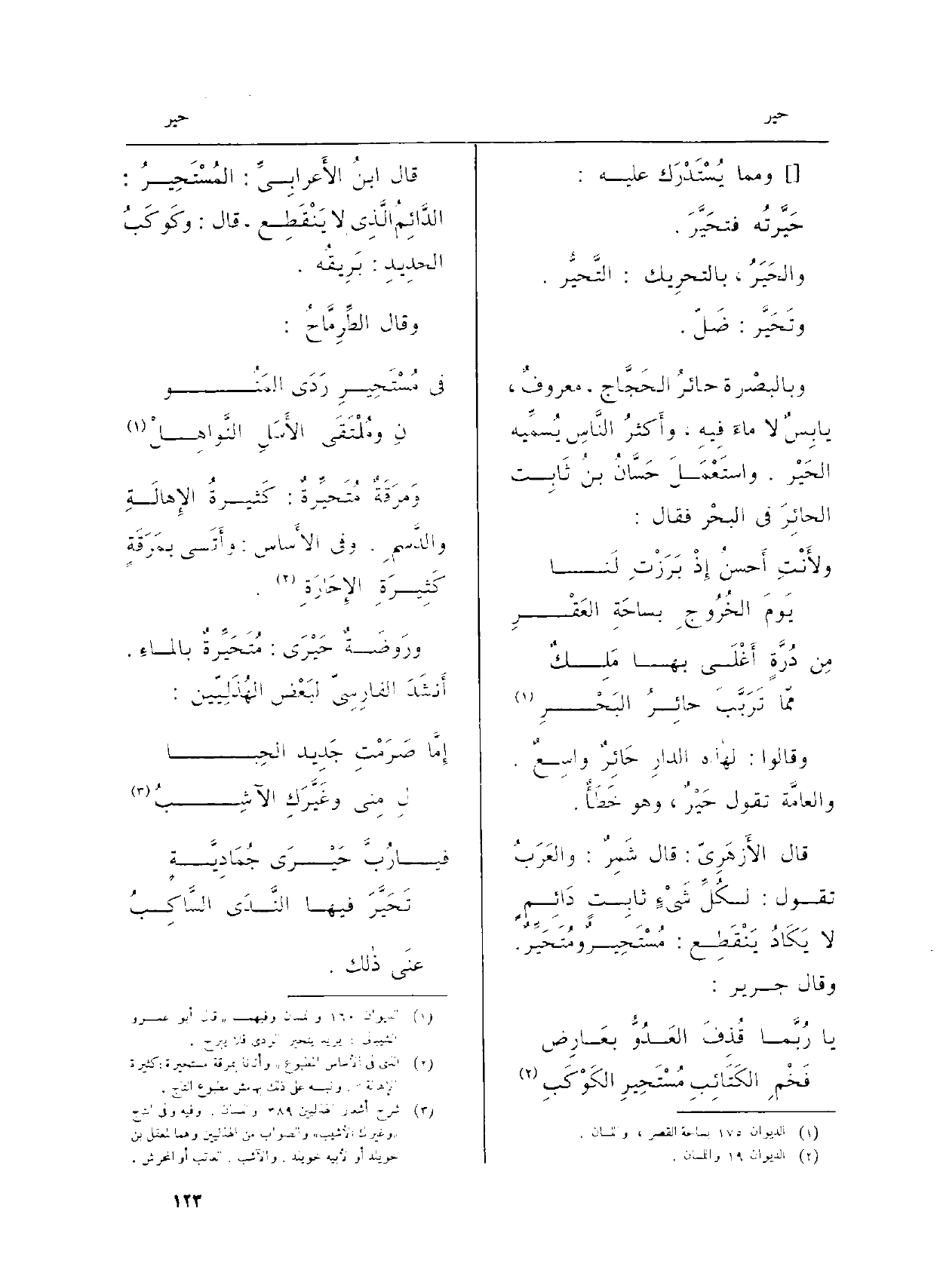 قَالَ الأَزهَرِيّ: قَالَ شَمِرٌ: والعَرَبُ تَقول: لكُلِّ شَيْءٍ ثابِتٍ دَائِمٍ لَا يَكَادُ يَنْقَطِع: مُسْتَحِيرٌ ومُتَحَيِّرٌ. وَقَالَ جرير: