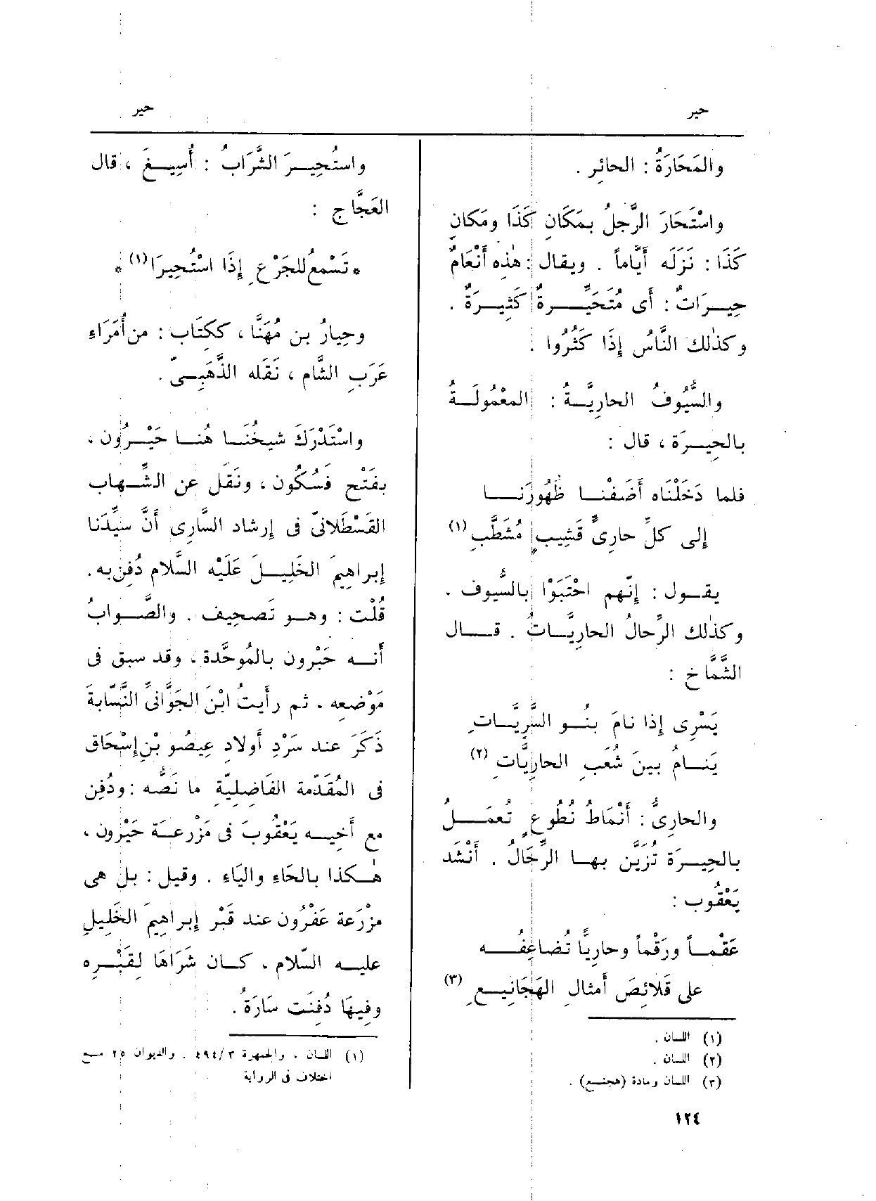 واسْتَدْرَكَ شيهُنَا هُنا حَيْرُون، بفَتْح فَسُكُون، ونَقَلَ عَن الشِّهاب القَسْطَلانيّ فِي إرشاد السَّارِي أَنَّ سيِّدَنا إِبراهِيمَ الخَلِيلَ عَلَيْه السَّلام دُفِن بِهِ. قُلْت: وَهُوَ تَصحِيف. والصَّوابُءَنه حَبْرون بالمُوحَصدة، وَقد سبق فِي مَوْضعِه، ثمَّ رأَيتُ ابْنَ الجَوَّانيِّ النَّسّابةَ ذَكَرَ عِنْد سَرْدِ أَولادِ عِيصُو بنِ إِسْحَاق فِي المُقَدّمة الفَاضِلِيّةِ مَا نَصُّه: ودُفِن مَعَ أَخِيه يَعْقُوبَ فِي مَزْرعَة حَيْرون، هاكذا بالحَاءِ واليَاءِ. وَقيل: بل هِيَ مزْرَعة عَفْرُون عِنْد قَبْر إِبراهِيمَ الخَلِيلِ عَلَيْهِ السّلام، كَانَ شَرَاهَا لِقَبْرِه وفِيهَا دُفِنَت سَارَةُ.